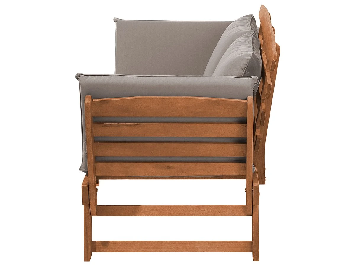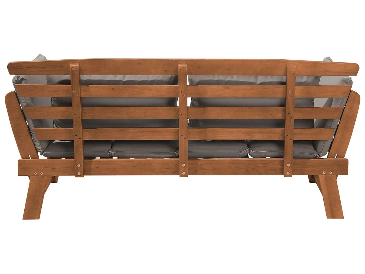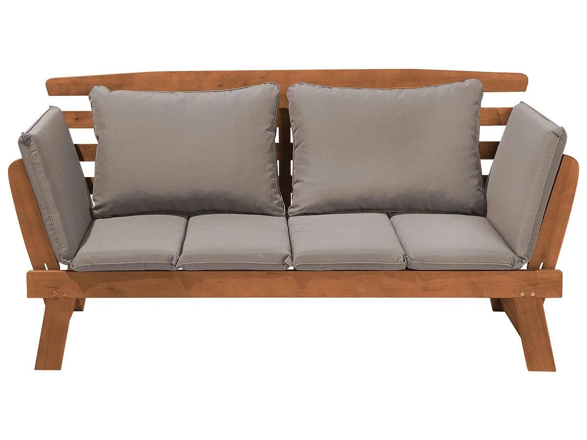 Elegante banco de jardín en madera de eucalipto con reposabrazos ajustables. ¡Este acogedor banco de jardín será tu nuevo lugar favorito en la terraza! Como un sofá de dos plazas, el banco del jardín ofrece mucho espacio para dos personas, y con unos sencillos pasos, los apoyabrazos se pliegan y tienes una cómoda tumbona para el sol. Los almohadones y cojines acolchados garantizan un óptimo confort. Las fundas en color gris están elaboradas en poliéster, repelente a la humedad y resistente a los rayos UV, y las fundas de las almohadas son extraíbles y lavables a 30°C. El robusto armazón con elegantes listones de madera de eucalipto oscuro combina a la perfección con cualquier diseño de jardín clásico. ¡Haz unas vacaciones de ensueño en tu propio jardín! Detalles: Tipo de Producto: Banco Estilo: Retro Color: Madera oscura Tipo de material: Madera maciza Material principal: Madera de eucalipto Material adicional: Poliéster Composición del Material: 100% Poliéster Densidad de espuma del asiento: 17 kg/m3 Dimensiones: Altura del apoyabrazos: 40 cm Profundidad: 66 cm Espesor del asiento: 6 cm Altura del asiento: 30 cm Ancho: 210 cm Altura: 82 cm Superficie del asiento: 132×63 cm Peso: 26 kg Capacidad de peso: 200 kg La oferta incluye: 1 x Banco, 1 x Cojín del asiento, 2 x Cojín Ventajas: Brinda comodidad y relajación, Perfecto para todo tipo de exterior, Estructura duradera y sólida, Resistencia UV 4 (ISO 105-B02, Muy fácil de conservar, Fundas extraíbles Información de montaje: Requiere montaje completo. 20-40 min. Información adicional: El producto viene con un libro de cuidados detallado para ayudarte a mantener tus muebles en las mejores condiciones durante muchos años. Consulta estos consejos para garantizar el mantenimiento adecuado de tus muebles nuevos – encontrarás las instrucciones de mantenimiento junto con el manual de montaje. Texto de resistencia: Gracias a su resistencia al agua, puedes utilizar el producto al aire libre y dejarlo a la intemperie durante lluvias ligeras. Si no es posible guardarlo en un lugar cerrado y protegido, recomendamos utilizar una funda protectora. La exposición prolongada a la humedad puede provocar daños en el mueble. Resistencia: Agua ligera / humedad Consejos de mantenimiento: Madera de eucalipto: 1.Los muebles con acabado de aceite deben volverse a engrasar antes de ponerlos en uso y al menos una vez al año, especialmente en el clima húmedo 2.Limpiar con un limpiador suave y un paño suave en la dirección de la veta. Secar con un paño inmediatamente después de limpiar 3.Durante el invierno o en condiciones climáticas adversas, utilice una funda protectora o guarde los muebles en el interior. Poliéster: 1.Lavar a mano o seleccionar un ciclo de lavado de lana (30 ° C, a menos que el fabricante especifique lo contrario. Lavar del revés con la cremallera cerrada 2.Cuando no esté en uso, manténgalo en un lugar limpio y seco para protegerlo de las condiciones atmosféricas 3.No secar en secadora y no planchar.