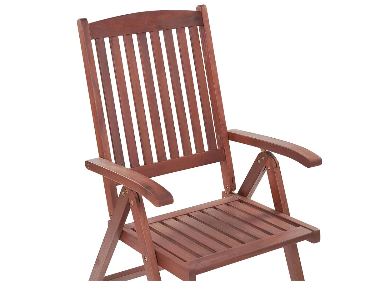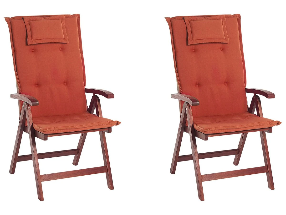 Conjunto de 2 sillas de jardín con cojines. Moderniza tu espacio al aire libre con este conjunto de 2 sillas de inspiración rústica. Fabricadas a partir de madera de acacia de alta calidad, se pueden colocar en distintos entornos. El respaldo reclinable permite configurar la silla como desees. Al ser plegables, puedes guardarlas cuando no estén en uso. Cada unidad incluye un cojín grueso que ofrece la máxima comodidad al sentarse. Detalles: Tipo de Producto: Silla de jardín Estilo: Rústico Color: Madera oscura Tonalidad: Rojo oscuro Tipo de material: Madera maciza Material principal: Madera de acacia Material adicional: Poliéster Material de las patas: Madera maciza Material del asiento: Tejido Composición del Material: 100% Poliéster Partes ajustables: Respaldo Apoyabrazo: Sí Acabado: Aceitado Plegable: Sí Apilable: No Dimensiones: Altura del apoyabrazos: 67 cm Profundidad: 69 cm Espesor del asiento: 5 cm Altura del asiento: 44 cm Ancho: 54 cm Altura: 105 cm Superficie del asiento: 48×43 cm Peso: 9 kg Capacidad de peso: 160 kg La oferta incluye: 2 x Silla, 2 x Cojín Ventajas: Respaldo ajustable en 6 posiciones, Las tiras ofrecen una fijación segura, Cómodos apoyabrazos, Resistencia UV 5 (ISO 105-B02, Materiales pensados para el uso en el exterior, Plegable para un fácil almacenamiento Información de montaje: No requiere montaje Información adicional: Por favor, ten en cuenta que la madera es un producto natural, y cada pieza puede presentar ligeras variaciones. Las diferencias en el color o la textura, como las arrugas u otras características naturales, no se consideran un defecto ni tampoco una base de reclamación, El producto viene con un libro de cuidados detallado para ayudarte a mantener tus muebles en las mejores condiciones durante muchos años. Consulta estos consejos para garantizar el mantenimiento adecuado de tus muebles nuevos – encontrarás las instrucciones de mantenimiento junto con el manual de montaje. Texto de resistencia: Gracias a su resistencia al agua, puedes utilizar el producto al aire libre y dejarlo a la intemperie durante lluvias ligeras. Si no es posible guardarlo en un lugar cerrado y protegido, recomendamos utilizar una funda protectora. La exposición prolongada a la humedad puede provocar daños en el mueble. Resistencia: Rayos UV Consejos de mantenimiento: Madera de acacia: 1.Durante el invierno o en condiciones climáticas adversas, utilice una funda protectora o guarde los muebles en el interior 2.Los muebles con acabado de aceite deben volverse a engrasar antes de ponerlos en uso y al menos una vez al año, especialmente en el clima húmedo 3.Limpiar con un limpiador suave y un paño suave en la dirección de la veta. Secar con un paño inmediatamente después de limpiar. Poliéster: 1.Aspire con un accesorio adecuado 2.Limpiar con champú seco y una esponja húmeda o un limpiador suave 3.Cuando no esté en uso, manténgalo en un lugar limpio y seco para protegerlo de las condiciones atmosféricas.