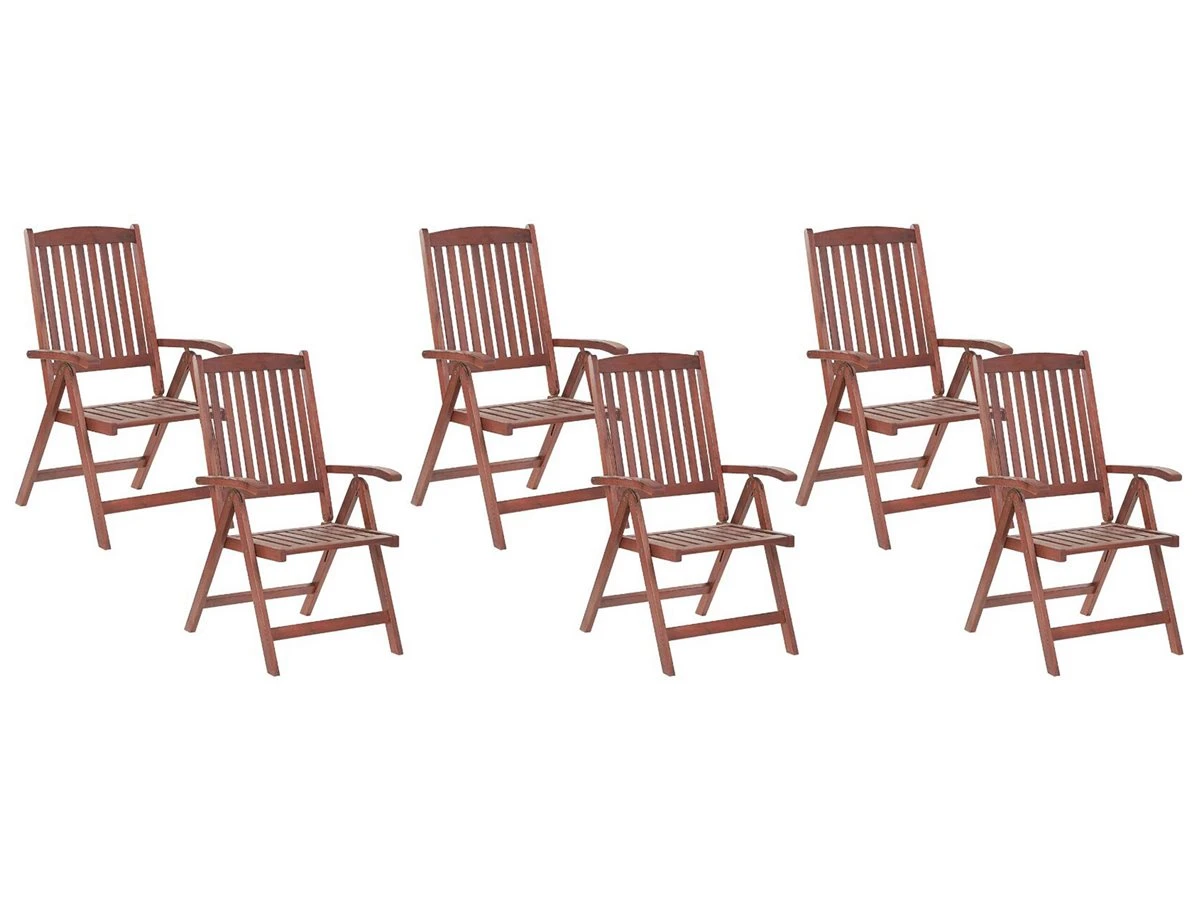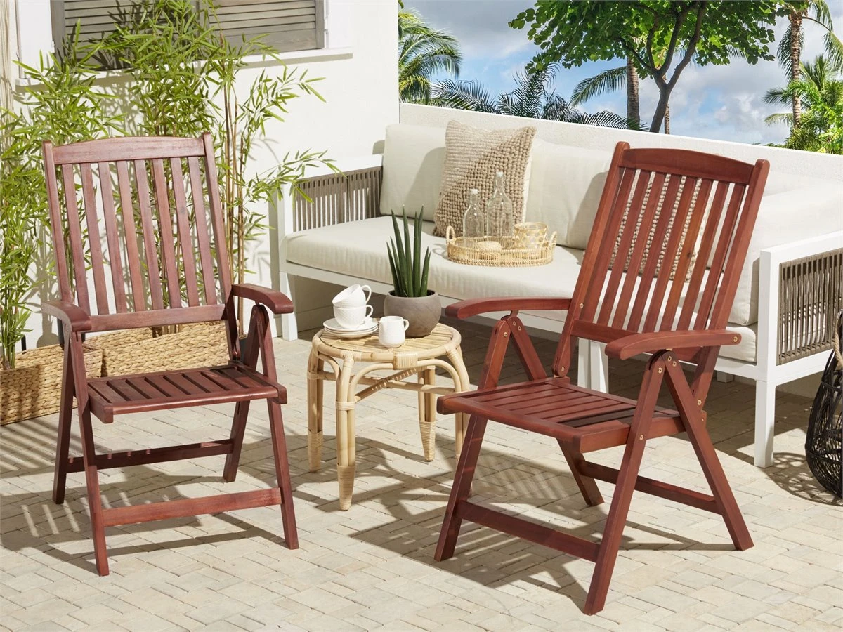 Sillas plegables para exteriores con respaldos ajustables. Agrega un toque de encanto campestre a tu jardín con estas elegantes sillas de inspiración rústica. Elaboradas de madera de acacia de alta calidad en un color marrón oscuro neutro, estas sillas complementan cualquier entorno al aire libre. La relajación también está garantizada gracias a los respaldos reclinables de las sillas que te permiten colocar estas piezas como desees y, para mayor comodidad, las sillas se pueden plegar para un fácil almacenamiento. Detalles: Tipo de Producto: Conjunto plegable Estilo: Rústico Color: Madera oscura Tonalidad: Rojo oscuro Tipo de material: Madera maciza Material principal: Madera de acacia Material adicional: Acero Material de las patas: Madera maciza Material del asiento: Madera maciza Apoyabrazo: Sí Acabado: Aceitado Plegable: Sí Apilable: No Dimensiones: Altura del apoyabrazos: 67 cm Profundidad: 69 cm Altura del asiento: 44 cm Ancho: 54 cm Altura: 105 cm Superficie del asiento: 48×43 cm Peso: 10 kg Capacidad de peso: 160 kg La oferta incluye: 6 x Silla Ventajas: Diseño atemporal, Combina con todo tipo de decoración, Apariencia moderna y calidad durante muchos años, Plegable, ahorra espacio, Materiales naturales, Respaldo ajustable Información de montaje: No requiere montaje Información adicional: Por favor, ten en cuenta que la madera es un producto natural, y cada pieza puede presentar ligeras variaciones. Las diferencias en el color o la textura, como las arrugas u otras características naturales, no se consideran un defecto ni tampoco una base de reclamación, El producto viene con un libro de cuidados detallado para ayudarte a mantener tus muebles en las mejores condiciones durante muchos años. Consulta estos consejos para garantizar el mantenimiento adecuado de tus muebles nuevos – encontrarás las instrucciones de mantenimiento junto con el manual de montaje. Texto de resistencia: Gracias a su resistencia al agua, puedes utilizar el producto al aire libre y dejarlo a la intemperie durante lluvias ligeras. Si no es posible guardarlo en un lugar cerrado y protegido, recomendamos utilizar una funda protectora. La exposición prolongada a la humedad puede provocar daños en el mueble. Resistencia: Agua ligera / humedad Consejos de mantenimiento: Madera de acacia: 1.Durante el invierno o en condiciones climáticas adversas, utilice una funda protectora o guarde los muebles en el interior 2.Los muebles con acabado de aceite deben volverse a engrasar antes de ponerlos en uso y al menos una vez al año, especialmente en el clima húmedo 3.Limpiar con un limpiador suave y un paño suave en la dirección de la veta. Secar con un paño inmediatamente después de limpiar.