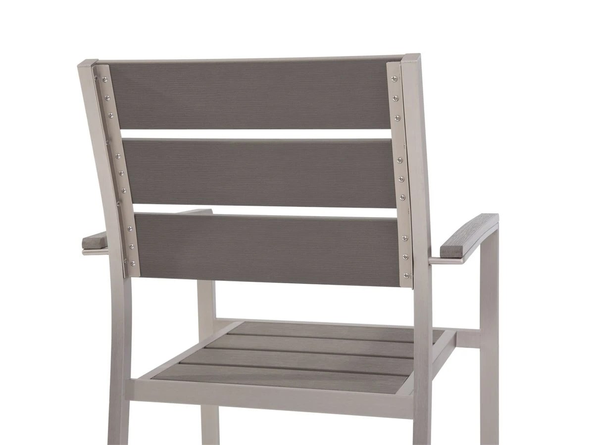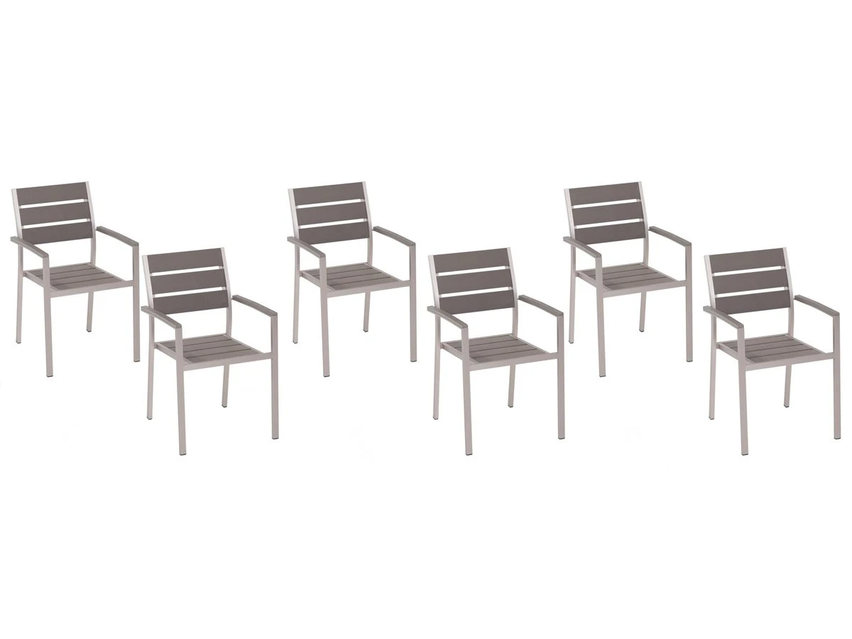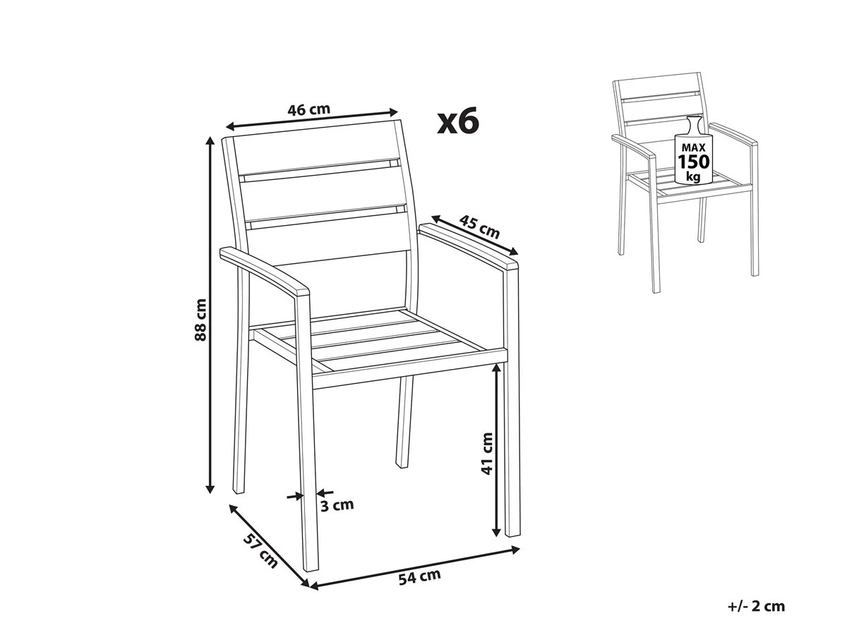 Conjunto de sillas de jardín. Este conjunto de sillas está compuesto de materiales similares a madera más alta calidad. Tanto este material como el aluminio son reciclables y respetuosos con el medio ambiente. Los muebles son resistentes a la intemperie, los rayos UV y la suciedad. Detalles: Tipo de Producto: Silla de jardín Estilo: Industrial Color: Madera clara Tipo de material: Material sintético Material principal: Madera plástica Material adicional: Aluminio Material de las patas: Metal Material del asiento: Material sintético Apoyabrazo: Sí Acabado: Revestimiento en polvo Plegable: No Apilable: Sí Dimensiones: Altura del apoyabrazos: 65 cm Profundidad: 57 cm Altura del asiento: 41 cm Ancho: 54 cm Altura: 88 cm Superficie del asiento: 47×40 cm Peso: 6 kg Capacidad de peso: 150 kg La oferta incluye: 6 x Silla Ventajas: Perfecto para todo tipo de exterior, Diseño atemporal, Ideal para uso en interiores y exteriores, Muy fácil de conservar, Apilable, ahorra espacio Información de montaje: No requiere montaje Información adicional: Evita colocar objetos de vidrio sobre la superficie del producto. Este material aumenta la temperatura de la luz solar, lo que puede causar sobrecalentamiento y daños al artículo. El producto viene con un libro de cuidados detallado para ayudarte a mantener tus muebles en las mejores condiciones durante muchos años. Consulta estos consejos para garantizar el mantenimiento adecuado de tus muebles nuevos – encontrarás las instrucciones de mantenimiento junto con el manual de montaje. Texto de resistencia: El producto es resistente al agua, lo que significa que no se dañará expuesto a la lluvia o en contacto con otros líquidos. Puede dejarlo al aire libre incluso durante fuertes lluvias o humedad. Durante la temporada de invierno es recomendable almacenar el producto en el interior o bajo una cubierta impermeable. Resistencia: Agua Consejos de mantenimiento: Aluminio: 1.Fuera de temporada, utilice una funda protectora o guarde los muebles en un lugar fresco y seco 2.Limpiar con agua jabonosa y detergentes suaves. Quitar el polvo con un paño suave. Madera plástica: 1.Manténgalo alejado de fuentes de calor, como parrilla o fuego, ya que las chispas pueden causar daños graves. No coloque utensilios calientes directamente sobre la superficie, 2.Limpiar con un limpiador a base de jabón suave y un paño suave, 3.El material es extremadamente resistente a la intemperie. Sin embargo, se recomienda utilizar una funda protectora para la temporada de invierno o, si es posible, guardar los muebles en un lugar fresco y seco.