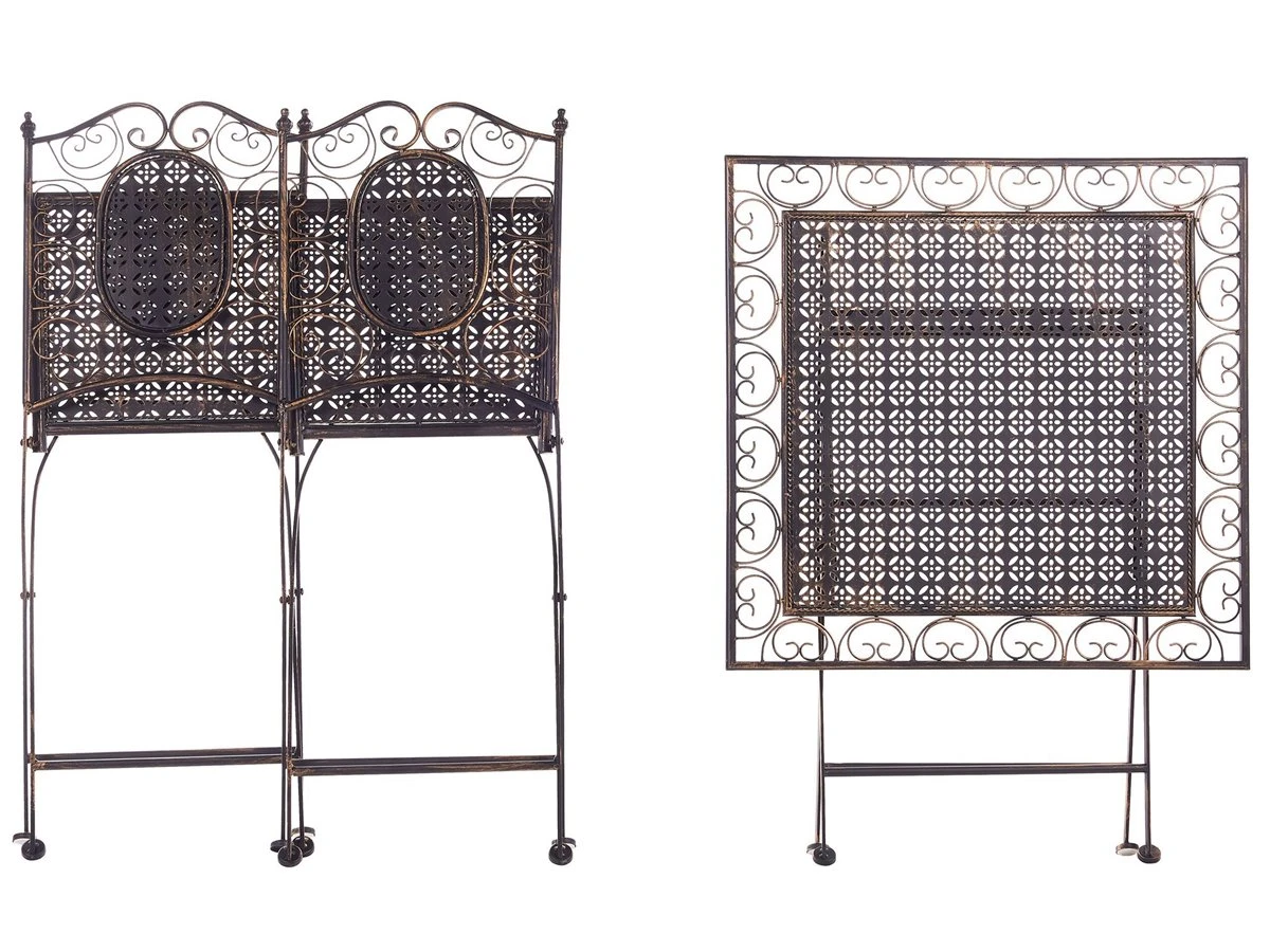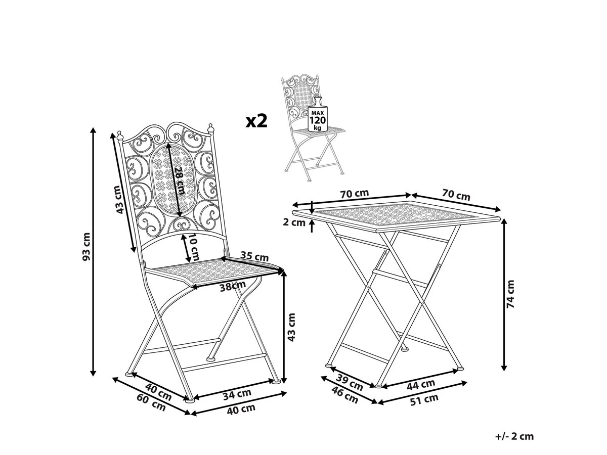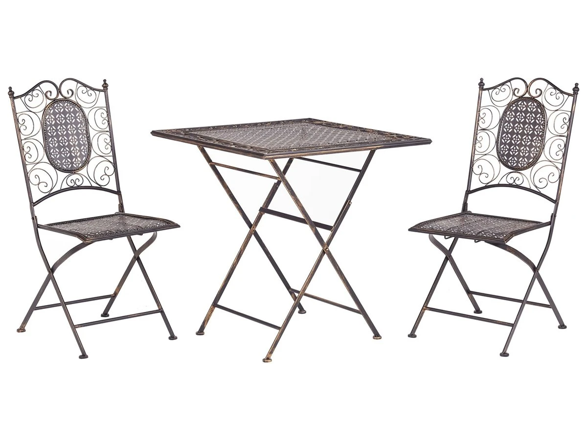 Conjunto de balcón. Aporta un toque de romanticismo a tu espacio al aire libre con este conjunto de balcón de 2 sillas y una mesa de inspiración vintage. El juego está fabricado a mano a partir de hierro recubierto de polvo de alta calidad. Cada elemento es plegable y se puede mover fácilmente de un lugar a otro. Los elementos decorativos únicos, el diseño y el acabado envejecido hacen que este conjunto mejore el aspecto y añada encanto a cualquier entorno al aire libre. Detalles: Tipo de Producto: Conjunto bistro Estilo: Retro Color: Negro Tipo de material: Metal Material principal: Hierro Material de la superficie: Metal Acabado: Revestimiento en polvo Dimensiones: Dimensiones de la silla: 40x60x93 cm Dimensiones de la mesa de centro: 70x70x74 Altura del asiento: 43 cm Peso: 17 kg Capacidad de peso de la silla: 120 kg Capacidad de peso de la mesa: 40 kg La oferta incluye: 2 x Silla, 1 x Mesa Ventajas: Estilo retro, Resistencia UV, Ideal para uso al aire libre, Plegable para un fácil almacenamiento, Compacto y perfecto para espacios limitados , Patas con tapas anti-deslizantes Información de montaje: No requiere montaje Información adicional: Abre el embalaje con cuidado, especialmente cuando utilizas herramientas afiladas o puntiagudas, ya que pueden dañar el producto, El efecto desgastado o las manchas visibles son intencionales y no se consideran un defecto. Texto de resistencia: Gracias a su resistencia al agua, puedes utilizar el producto al aire libre y dejarlo a la intemperie durante lluvias ligeras. Si no es posible guardarlo en un lugar cerrado y protegido, recomendamos utilizar una funda protectora. La exposición prolongada a la humedad puede provocar daños en el mueble. Resistencia: Agua ligera / humedad Consejos de mantenimiento: Hierro: 1.Cualquier daño a la capa de pintura exterior debe protegerse de la humedad 2.Para garantizar la protección contra la corrosión, evite los limpiadores alcalinos o ácidos. Después de limpiar, secar bien 3.Quite las tapas protectoras con regularidad para que salga todo el líquido, déjelas secar y utilice un spray anticorrosión si es necesario 4.Limpiar con detergentes suaves 5.Los muebles de acero y sus elementos no deben exponerse al agua. De lo contrario, existe la posibilidad de que el agua oxidada salga de las tuberías del marco 6.Cuando no estén en uso, los muebles deben guardarse en el interior o bajo una cubierta protectora 7.Para aumentar la durabilidad del artículo, manténgalo seco y recuerde la limpieza regular.