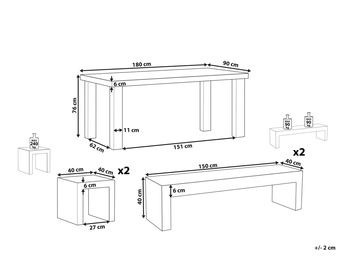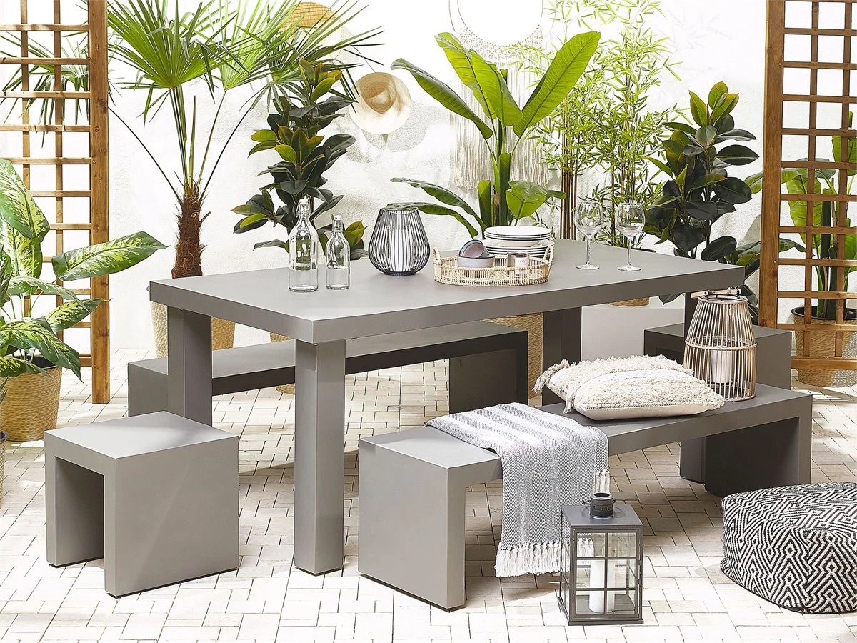 Conjunto de muebles de jardín para 6 personas. Un moderno juego de comedor de cemento que cambiará tu forma de pensar sobre esta materia prima. Con forma cuadrada y líneas simples y limpias que agregan una sensación industrial a tu exterior. Construido con cemento reforzado con un marco de acero para mayor estabilidad. De esa manera, es más liviano que el concreto sólido, lo que facilita el transporte de los muebles. El material cuidadosamente elegido es resistente a las manchas y fácil de cuidar. La forma minimalista combina perfectamente con el aspecto sencillo del clásico hormigón. Detalles: Tipo de Producto: Conjunto de comedor Estilo: Industrial Color: Gris Tipo de material: Cemento Material principal: Cemento reforzado con fibra Material adicional: Acero Material de la superficie: Cemento Acabado: Mate Dimensiones: Dimensiones del banco: 150x40x40 Dimensiones de la silla: 40x40x45 cm Altura del asiento: 40/45 cm Dimensiones de la mesa: 180x90x76 cm Peso: 136 kg Capacidad de peso de la silla: 240 kg Capacidad de peso de la mesa: 60 kg La oferta incluye: 1 x Mesa, 2 x Banco, 2 x Taburete Ventajas: Acabado de hormigón para aspecto industrial, Ideal para uso en interiores y exteriores, No requiere mantenimiento regular, Alta calidad, Estructura sólida y estable Información de montaje: Requiere montaje de las patas. 20-40 min. Información adicional: Ten en cuenta que cada modelo puede diferir ligeramente de la presentación en la imagen. La disposición de colores y piezas de material puede ser diferente. Esto se considera como la característica del producto, no su defecto. Dependiendo de la humedad del aire, los muebles de concreto pueden tener grietas, agujeros o cambiar de color. Es una característica natural del material y no afecta su calidad. Texto de resistencia: Gracias a su resistencia al agua, puedes utilizar el producto al aire libre y dejarlo a la intemperie durante lluvias ligeras. Si no es posible guardarlo en un lugar cerrado y protegido, recomendamos utilizar una funda protectora. La exposición prolongada a la humedad puede provocar daños en el mueble. Resistencia: Agua ligera / humedad Consejos de mantenimiento: Cemento: 1.Durante el invierno utilice una funda protectora o guarde los muebles en el interior 2.Para evitar manchas, no utilice detergentes cremosos o detergentes con ácidos o aceites.