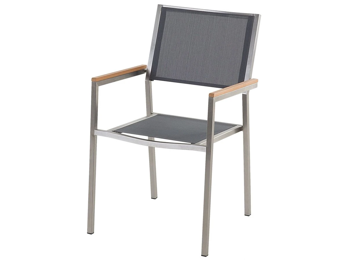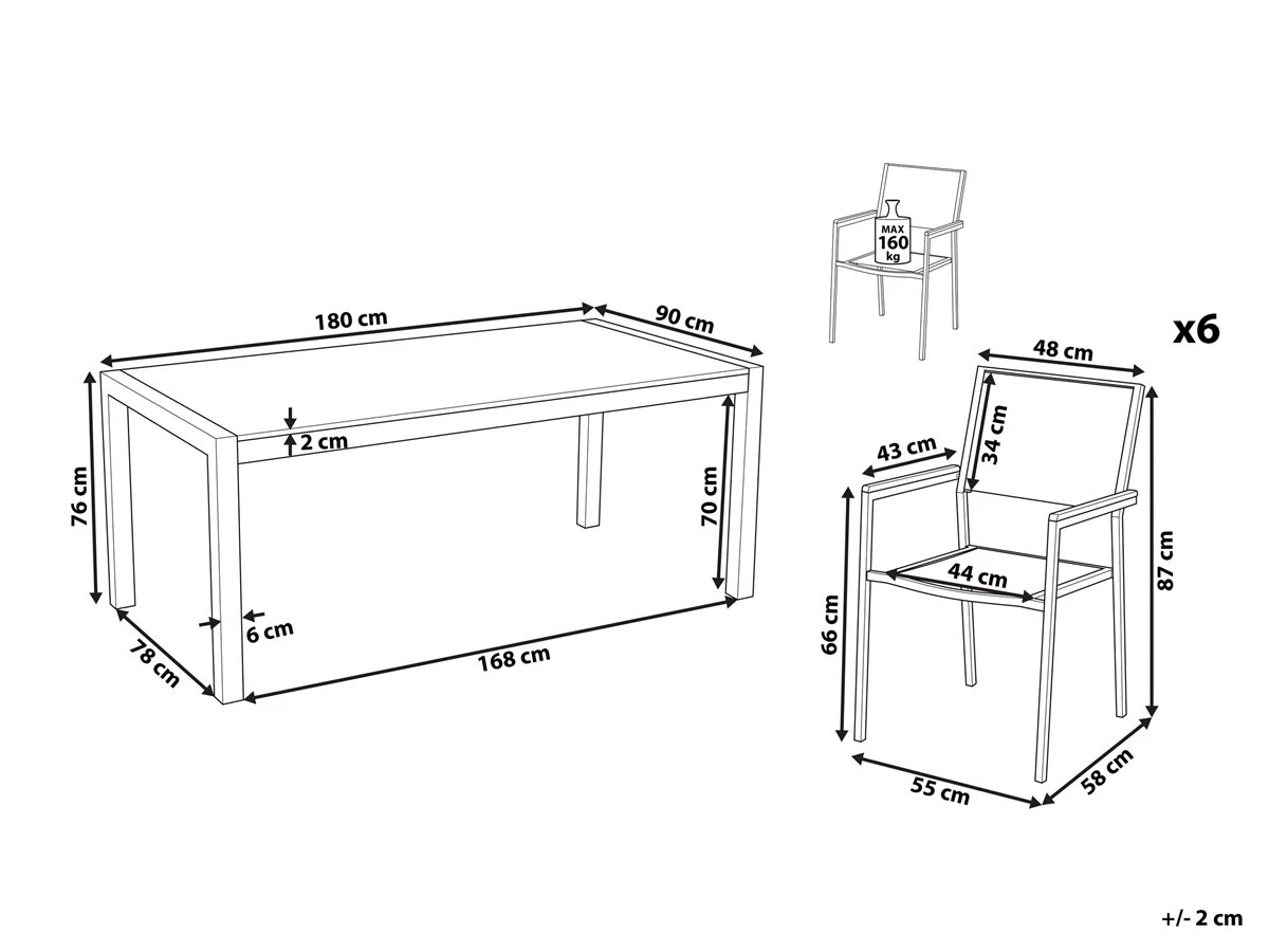 Elegante juego de comedor con mesa con superficie en piedra natural. Añade elegancia a tu zona exterior con este conjunto de comedor. Está constituido por una mesa y 6 sillas. Fabricado a partir de acero inoxidable duradero y granito resistente a la intemperie. Las sillas son resistentes a los rayos UV y apilables, lo que permite ahorrar espacio. Detalles: Tipo de Producto: Conjunto de comedor Estilo: Moderno Color: Gris Tonalidad: Grafito Tipo de material: Piedra Material principal: Acero inoxidable Material adicional: Madera plástica Material de la superficie: Piedra Composición del Material: 90% PVC Acabado: Flameado Dimensiones: Dimensiones de la silla: 55x58x87 cm Altura del asiento: 44 cm Dimensiones de la mesa: 180x90x76 cm Dimensiones totales: 180x90x70 Peso: 170 kg Capacidad de peso de la silla: 160 kg Capacidad de peso de la mesa: 70 kg La oferta incluye: 1 x Mesa, 6 x Silla Ventajas: Perfecto para todo tipo de exterior, Robusto marco resistente a la corrosión, Resistencia UV 4 (ISO 105-B02, Resistente a las manchas, Material impermeable y muy fácil de conservar, Apilable para un almacenaje mejor, Montaje muy sencillo Información de montaje: Requiere montaje parcial. 20-40 min. Información adicional: El producto viene con un libro de cuidados detallado para ayudarte a mantener tus muebles en las mejores condiciones durante muchos años. Consulta estos consejos para garantizar el mantenimiento adecuado de tus muebles nuevos – encontrarás las instrucciones de mantenimiento junto con el manual de montaje. Texto de resistencia: Gracias a su resistencia al agua, puedes utilizar el producto al aire libre y dejarlo a la intemperie durante lluvias ligeras. Si no es posible guardarlo en un lugar cerrado y protegido, recomendamos utilizar una funda protectora. La exposición prolongada a la humedad puede provocar daños en el mueble. Resistencia: Manchas Consejos de mantenimiento: Granito: 1.Seque con un paño después de limpiar 2.Durante el invierno, use una cubierta protectora o guarde los muebles en el interior 3.Utilice solo detergentes suaves o limpiadores específicos para granito. No utilice limpiadores abrasivos. Secar después de limpiar 4.Las manchas difíciles como la salsa de tomate o el vino tinto penetran rápidamente en la superficie y, por lo tanto, deben eliminarse inmediatamente. Acero inoxidable: 1.Durante el invierno, utilice una funda protectora o guarde los muebles en el interior 2.Durante la lluvia, se recomienda utilizar una funda protectora 3.Limpiar solo con agentes de limpieza suaves. No utilice limpiadores alcalinos o ácidos 4.Las lluvias ácidas, el agua salada y las tormentas de arena pueden dañar la capa protectora.