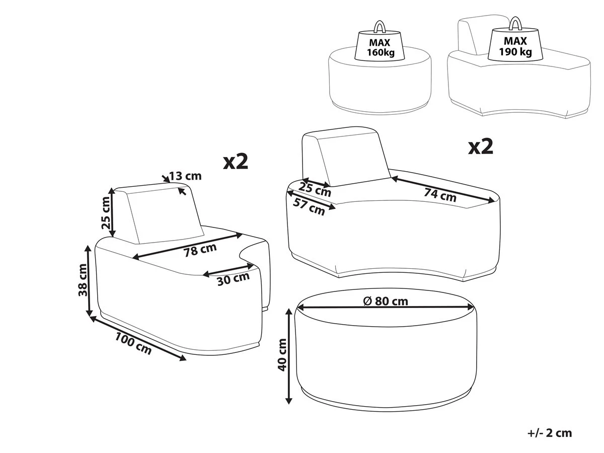 Juego de exterior. Añade a tu zona exterior este conjunto de sala de estar de estilo minimalista. Está constituido por 4 sillones y un reposapiés. Fabricado a partir de tela de poliéster de alta calidad y resistente a los rayos UV. El juego ofrece múltiples posibilidades de configuración. Juntando los sillones obtienes dos sofás de 2 plazas o una cama de exterior. Puedes utilizar el reposapiés como otomana, mesa auxiliar o asiento adicional. Detalles: Tipo de Producto: Conjunto longue Estilo: Moderno Color: Gris Tonalidad: Gris claro Tipo de material: Tejido Material principal: Poliéster Material adicional: Aluminio Composición del Material: 100% Poliéster Densidad de espuma del asiento: 28 kg/m3 Dimensiones: Dimensiones de la silla: 100x78x63 cm Dimensiones del reposapies: 80x80x40 cm Altura del asiento: 38 cm Peso: 38 kg Capacidad de peso por persona: 190 kg La oferta incluye: 4 x Silla, 1 x Puf Ventajas: Brinda comodidad y relajación, El grueso acolchado del asiento brinda comodidad, Diseño moderno, Resistencia UV 8 (ISO 105-B02, El material QuickDry Foam® evita la absorción de agua, Ideal para uso en interiores y exteriores, Muchas posibilidades de posición Información de montaje: No requiere montaje Texto de resistencia: El producto está hecho con tela resistente a los rayos UV, lo que significa que se puede usar bajo la luz del sol sin preocuparse por la pérdida de color. En cualquier caso, es recomendable colocar los muebles debajo de una cubierta impermeable cuando no se utilicen, para asegurar su máxima durabilidad. Resistencia: Rayos UV Consejos de mantenimiento: Poliéster: 1.Aspire con un accesorio adecuado 2.Limpiar con champú seco y una esponja húmeda o un limpiador suave 3.Cuando no esté en uso, manténgalo en un lugar limpio y seco para protegerlo de las condiciones atmosféricas.