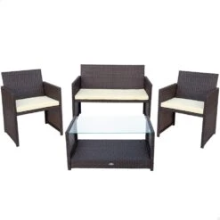 Conjunto de muebles de jardín Aktive Garden compuesto de dos sillones, un sofá y una mesa central. Tanto los sillones como la mesa están fabricados de ratán sintético, un material fácil de limpiar y resistente al agua y a la intemperie. Para un mayor confort y facilidad de uso, tanto los sillones como el sofá incluyen cojín acolchado color crema (poliéster 180 gramos y la mesita cuenta con superficie de cristal para facilitar su limpieza y con balda inferior. Cada sillón mide 59 cm de ancho, 59 cm de largo y 76 cm de alto; el sofá mide 108 cm de ancho, 59 cm de largo y 76 cm de alto; la mesa mide 81 cm de ancho 45 cm de largo y 41 cm de alto. Conjunto ideal para usar en interior y en exterior.