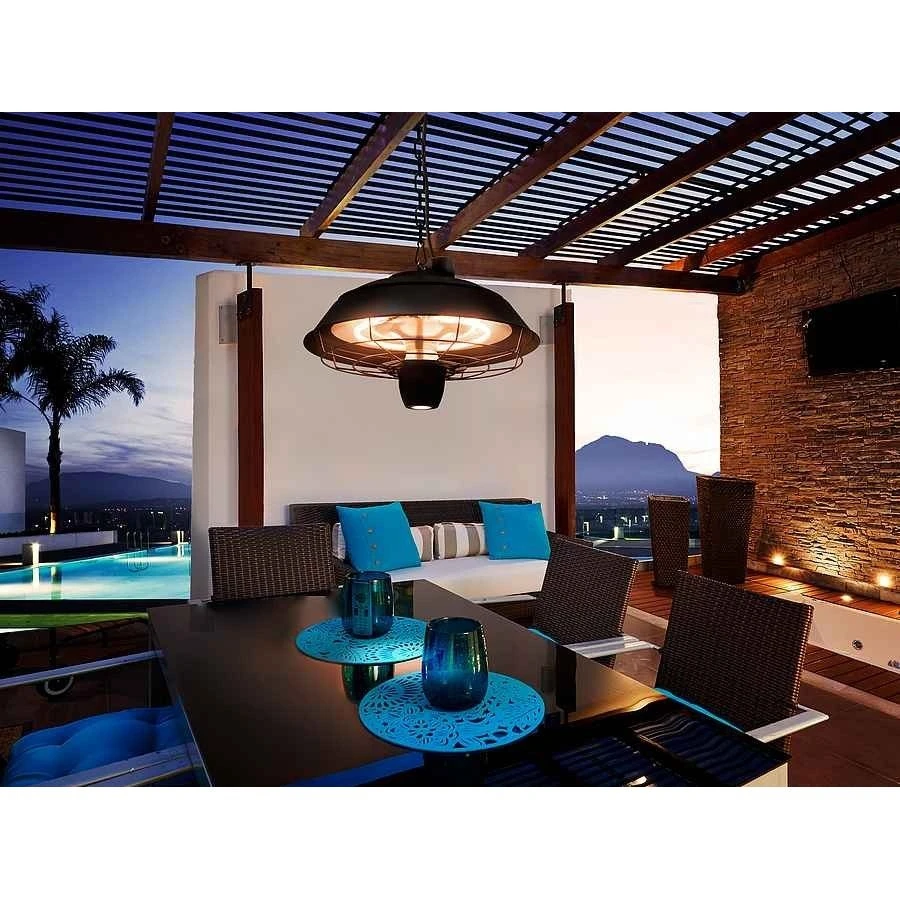 Estufa electrica modelo HEAT VINTAGE para instalación a techo, tipo suspensión. Realizada en metal y plástico, acabado negro. Calefacción halógena de 600/900/1500W. Luz LED de 1W. Mando a distancia. Cable:1,8 m. IP44.