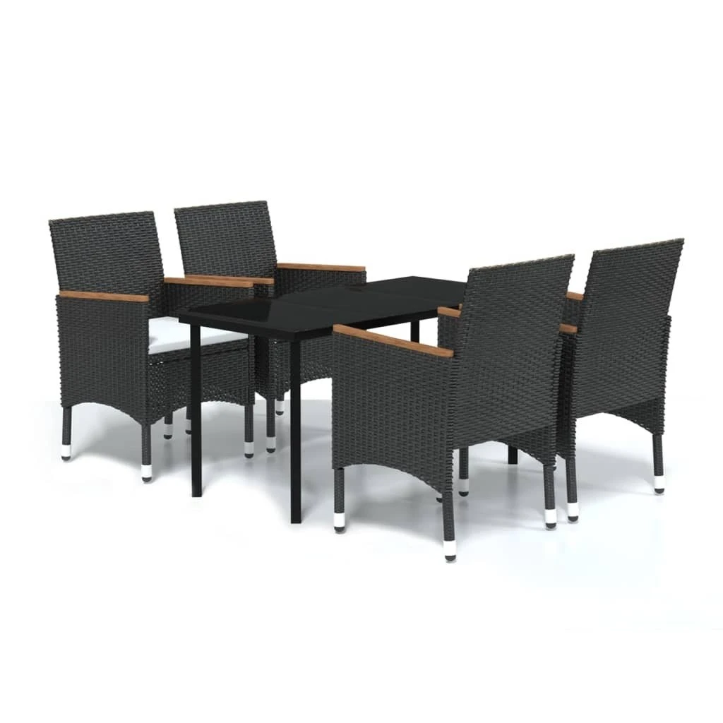 ¡Este juego de comedor de jardín es una excelente opción para cenar o relajarse en el espacio al aire libre de tu casa! Las estructuras de acero con recubrimiento en polvo hacen que la mesa y las sillas sean robustas y estables para usar a diario en exteriores. Gracias al ratán PE resistente al agua, las sillas son fáciles de limpiar y adecuadas para el uso diario. Asimismo, la lisa superficie de vidrio se limpia fácilmente con un paño húmedo y es perfecta para colocar comida, bebida y otros artículos decorativos. Nota: Para prolongar la vida de tus muebles de exterior, te recomendamos que los protejas con una funda impermeable. Color: NegroMaterial: Ratán PE, acero con revestimiento en polvo, vidrio, madera maciza de acaciaDimensiones: 140 x 70 x 74 cm (largo x ancho x altoDimensiones de la silla: 52 x 57 x 84 cm (ancho x profundo x altoAncho del asiento: 39/44.5 cmProfundidad del asiento: 46 cmAltura del reposabrazos desde el suelo: 62/65 cmGrosor del cojín del asiento: 4 cmRequiere montaje: SíLa entrega contiene:1 x Mesa4 x Sillas4 x Cojín
