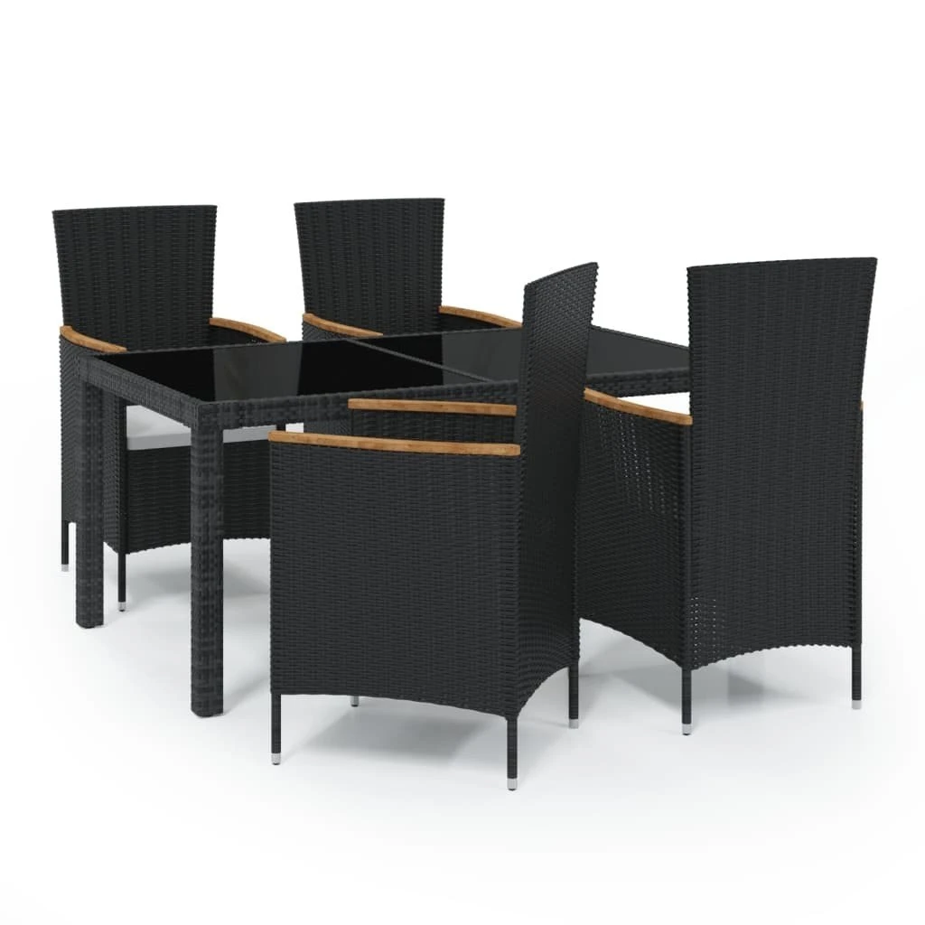 Con un diseño elegante y una estructura de acero duradero, este juego de muebles de comedor es la opción perfecta para tu espacio al aire libre. Este juego de comedor de jardín cuenta con una estructura de acero con recubrimiento en polvo, lo que hace que la mesa y las sillas sean estables y duraderas. Gracias al ratán PE resistente a la intemperie y al agua, el conjunto de muebles de exterior es fácil de limpiar. Los gruesos cojines extraíbles del asiento aumentan la comodidad del asiento y son fáciles de lavar. Nota: Para prolongar la vida de tus muebles de exterior, te recomendamos que los protejas con una funda impermeable. Mesa:Color: NegroMaterial: Ratán sintético, acero con recubrimiento en polvo, vidrio templadoDimensiones: 150 x 90 x 75 cm (largo x ancho x altoSilla:Color del ratán sintético: NegroColor de cojines: Blanco cremaMaterial: Ratán sintético, madera maciza de acacia, acero con recubrimiento en polvo, tela (100 % poliésterDimensiones: 61 x 60 x 88 cm (ancho x profundo x altoRequiere montaje: SíLa entrega contiene:1 x Mesa4 x Silla4 x Cojín