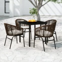 ¡Crea una estética atractiva y cohesionada en el espacio al aire libre de tu casa con este juego de comedor para jardín! Este juego de comedor de jardín está hecho de una estructura de acero con recubrimiento en polvo, lo que lo hace robusto y estable para el uso diario al aire libre. La superficie de vidrio liso es fácil de limpiar con un paño húmedo y es perfecto para colocar comida, bebidas y otros artículos decorativos. Las sillas de jardín están hechas de ratán de PVC, lo que las hace duraderas y resistentes a las inclemencias del tiempo y a los rayos UV. Además, cada asiento viene con un cojín grueso acolchado extraíble para mayor comodidad en tu tiempo de descanso. Nota: Para prolongar la vida de tus muebles de exterior, te recomendamos que los protejas con una funda impermeable. Mesa:Color: NegroMaterial: Acero con recubrimiento en polvo, vidrioDimensiones: 80 x 80 x 74 cm (largo x ancho x altoSilla:Color: MarrónColor de cojines: Blanco cremaMaterial del cojín: Tela (100% poliésterMaterial: Ratán PVC, acero con recubrimiento en polvoDimensiones: 58 x 58 x 78 cm (ancho x profundo x altoAltura del asiento desde el suelo: 46 cmRequiere montaje: SíLa entrega contiene:1 x Mesa4 x Sillas4 x Cojines de asiento