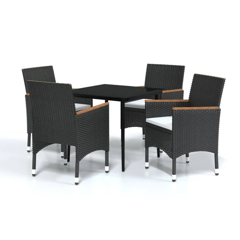 ¡Este juego de comedor de jardín es una excelente opción para cenar o relajarse en el espacio al aire libre de tu casa! Las estructuras de acero con recubrimiento en polvo hacen que la mesa y las sillas sean robustas y estables para usar a diario en exteriores. Gracias al ratán PE resistente al agua, las sillas son fáciles de limpiar y adecuadas para el uso diario. Asimismo, la lisa superficie de vidrio se limpia fácilmente con un paño húmedo y es perfecta para colocar comida, bebida y otros artículos decorativos. Nota: Para prolongar la vida de tus muebles de exterior, te recomendamos que los protejas con una funda impermeable. Color: NegroMaterial: Ratán PE, acero con revestimiento en polvo, vidrio, madera maciza de acaciaDimensiones de la mesa: 80 x 80 x 74 cm (largo x ancho x altoDimensiones de la silla: 52 x 57 x 84 cm (ancho x profundo x altoAncho del asiento: 39/44.5 cmProfundidad del asiento: 46 cmAltura del reposabrazos desde el suelo: 62/65 cmGrosor del cojín del asiento: 4 cmRequiere montaje: SíLa entrega contiene:1 x Mesa4 x Sillas4 x Cojín