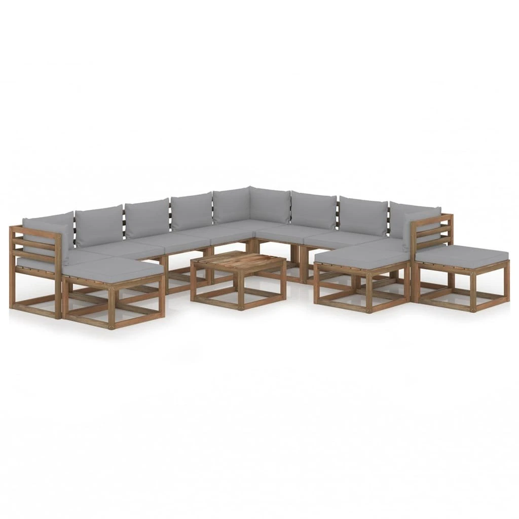 Este juego de muebles de jardín es una excelente opción para relajarte y disfrutar del buen tiempo, echar una siesta o charlar con tu familia o amigos. El conjunto de jardín está hecho de madera maciza de pino, lo que lo hace robusto y estable. ¡Puedes combinarlo con otros segmentos modulares para crear tus propias configuraciones de set de salón de jardín personal! Nota: Para prolongar la vida útil de los muebles de exterior, te recomendamos que los limpies con regularidad y no los dejes al aire libre sin protección innecesariamente.Limpieza: Usa una solución de jabón suaveAlmacenamiento: Si es posible, guarda el producto en un lugar fresco y seco en el interior. Si el producto se almacena al aire libre, protégelo con una funda impermeable. Limpia y seca el exceso de agua o nieve de las superficies planas después de una lluvia o nevada. Permite la ventilación para evitar daños relacionados con la humedad. Color del cojín: GrisMaterial: Madera de pino impregnada, tela (100% poliésterDimensiones del reposapiés/mesa: 60 x 60 x 36,5 cm (largo x ancho x altoDimensiones del sofá central: 60 x 64 x 70 cm (ancho x profundo x altoDimensiones del sofá esquinero: 64 x 64 x 70 cm (ancho x profundo x altoDimensiones del cojín de asiento: 60 x 60 x 6 cm (largo x ancho x grosorDimensiones de cojín de respaldo: 60 x 38 x 13 cm (largo x ancho x grosorDimensiones de cojín lateral: 55,5 x 38 x 13 cm (largo x ancho x grosorRequiere montaje: SíLa entrega incluye:1 x Mesa3 x Reposapiés5 x Sofás centrales3 x Sofás de esquina11 x Cojines de asiento8 x Cojines de respaldo3 x Cojín lateral