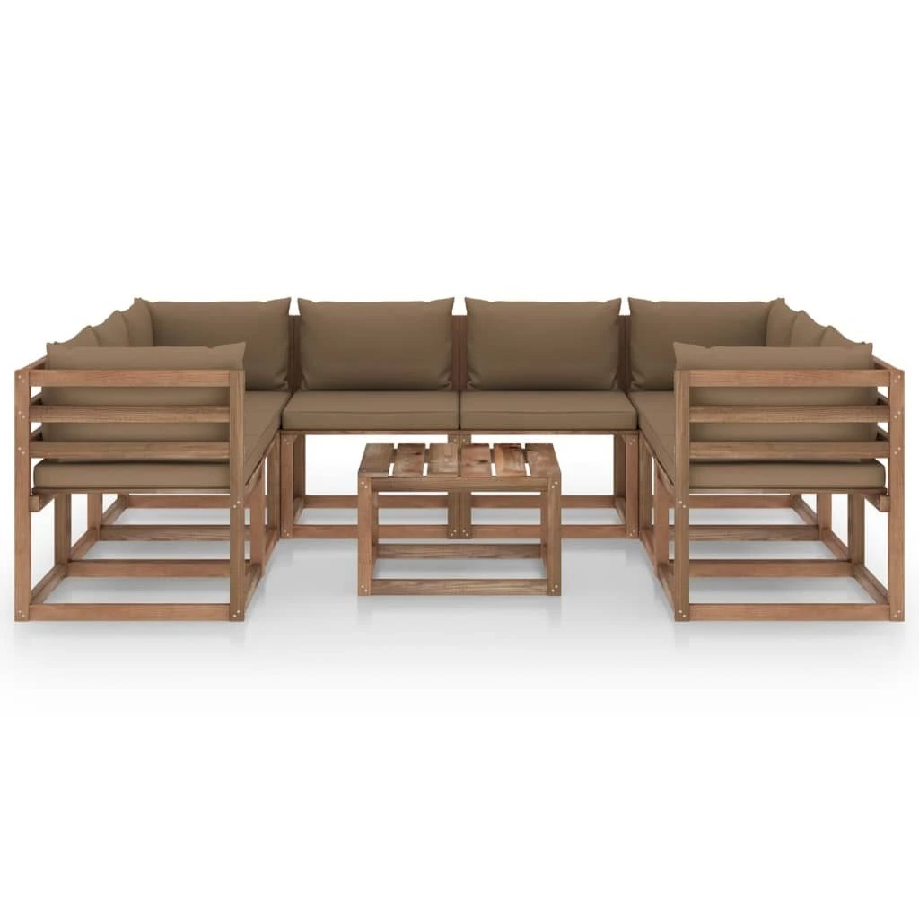 Este juego de muebles para jardín de madera es una opción ideal para que te relajes y disfrutes del buen tiempo, eches una siesta o charles con tu familia o tus amigos. Con un diseño de palés atemporal, este juego de muebles agrega un toque de encanto rústico a tu hogar. El juego de salón está hecho de madera de pino impregnada, lo que lo hace duradero, resistente a la intemperie y respetuoso con el medio ambiente. Este conjunto de muebles tiene una construcción maciza y requiere poco mantenimiento. Gracias a la tapicería 100% poliéster y al grueso acolchado, los cojines incluidos son suaves y cómodos. Nota: Para prolongar la vida útil de los muebles de exterior, te recomendamos que los limpies con regularidad y no los dejes al aire libre sin protección innecesariamente.Limpiar: Usa una solución de jabón suaveAlmacenamiento: Si es posible, guarda el producto en un lugar fresco y seco en el interior. Si el producto se almacena al aire libre, protégelo con una funda impermeable. Limpia y seca el exceso de agua o nieve de las superficies planas después de una lluvia o nevada. Permite la ventilación para evitar daños relacionados con la humedad. Color de cojín: Gris taupeMaterial del sofá: Madera de pino impregnadaMaterial del cojín: Tela (100% poliésterDimensiones del sofá esquinero: 64 x 64 x 70 cm (ancho x profundo x altoDimensiones del sofá central: 60 x 64 x 70 cm (ancho x profundo x altoDimensiones de mesa: 60 x 60 x 36,5 cm (largo x ancho x altoDimensiones del cojín de asiento: 60 x 60 x 6 cm (ancho x profundo x altoDimensiones de cojín de respaldo: 60 x 38 x 13 cm (ancho x profundo x altoDimensiones de cojín lateral: 55,5 x 38 x 13 cm (ancho x profundo x altoPeso de la tela: 120 g/m²Anchura de asiento: 60 cmProfundidad del asiento: 60 cmAltura del asiento desde el suelo: 36 cmRequiere montaje: SíLa entrega incluye:4 x Sofás de esquina4 x Sofás centrales1 x Mesa8 x Cojines de asiento8 x Cojines de respaldo4 x Cojines laterales