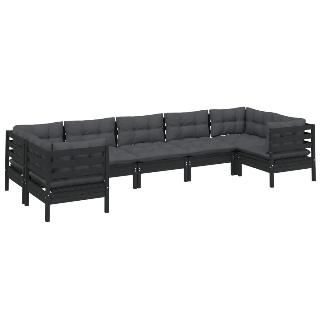 Este juego de muebles de jardín de madera es una excelente opción para relajarte y disfrutar del buen tiempo, echar una siesta o charlar con tu familia o amigos. El conjunto de muebles de jardín está hecho de madera maciza de pino, lo que lo hace robusto y estable. ¡Puedes combinarlo con otros segmentos modulares para crear tus propias configuraciones de set de salón de jardín personal! Nota: Para prolongar la vida útil de los muebles de exterior, te recomendamos que los limpies con regularidad y no los dejes al aire libre sin protección innecesariamente.Limpia: Usa una solución de jabón suaveAlmacenamiento: Si es posible, guárdalos en un lugar fresco y seco en el interior. Si el producto se almacena al aire libre, protégelo con una funda impermeable. Limpia y seca el exceso de agua o nieve de las superficies planas después de una lluvia o nevada. Permite la ventilación para evitar daños relacionados con la humedad. Color: NegroColor de cojín: Gris antracitaMaterial: Madera maciza de pino, tela (100% poliésterDimensiones del sofá de esquina/medio: 63,5 x 63,5 x 62,5 cm (ancho x profundo x altoDimensiones del cojín de asiento: 60 x 60 x 5 cm (largo x ancho x grosorDimensiones del cojín de respaldo/lateral: 60 x 32 x 5 cm (largo x ancho x grosorRequiere montaje: SíLa entrega incluye:4 x Sofás de esquina3 x Sofás centrales7 x Cojines de asiento11 x Cojines traseros/laterales