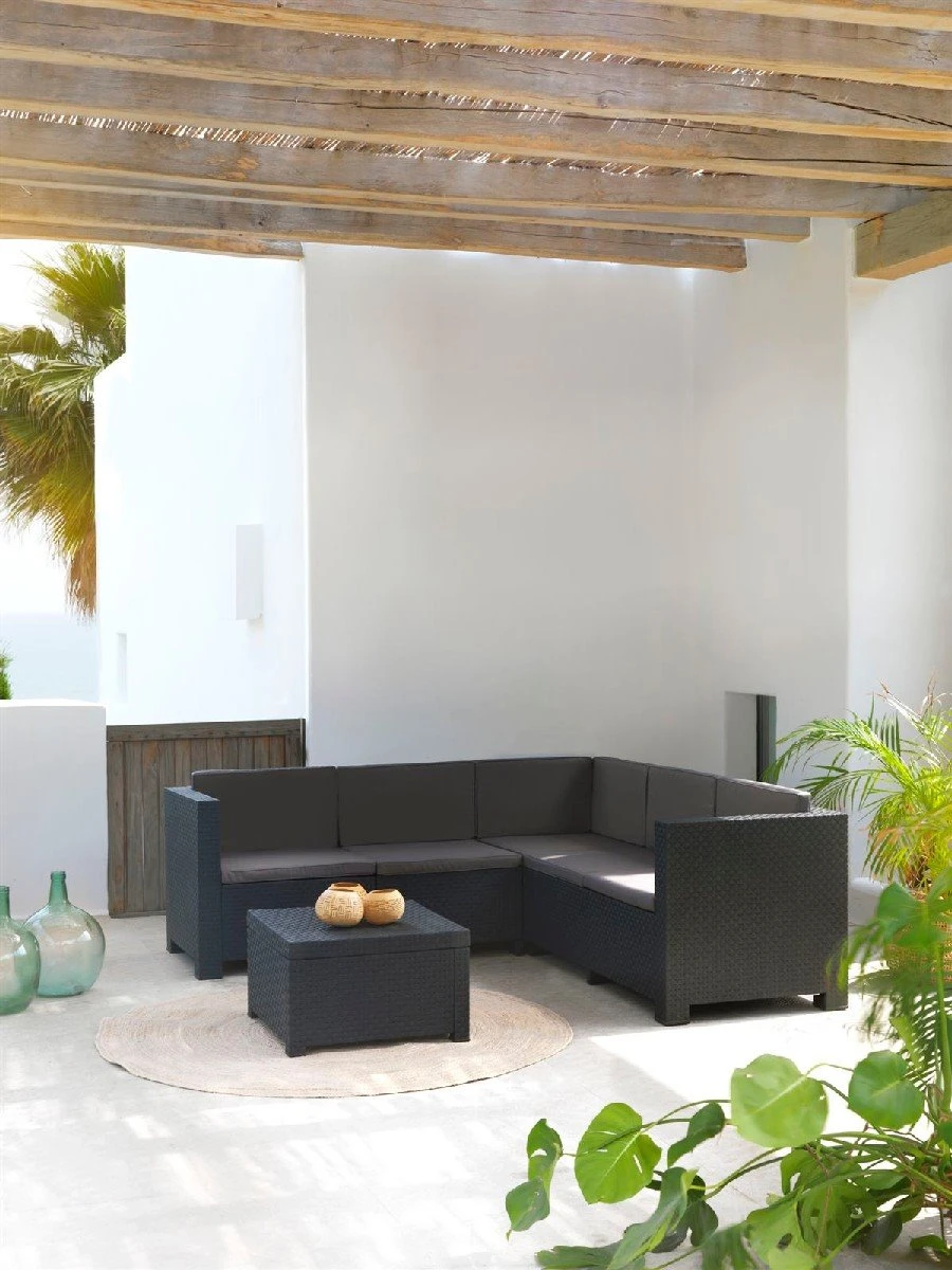 Transforma tu jardín en un impresionante espacio al aire libre con el set de jardín Oasis. Fabricado en resina de calidad con un bonito acabado color grafito, este conjunto incluye una rinconera de 5 plazas y una mesa de acompañamiento. Disfruta de una cena al aire libre durante horas de relajación con familia y amigos sin renunciar a la comodidad gracias a los cojines mullidos incluidos en el modelo.