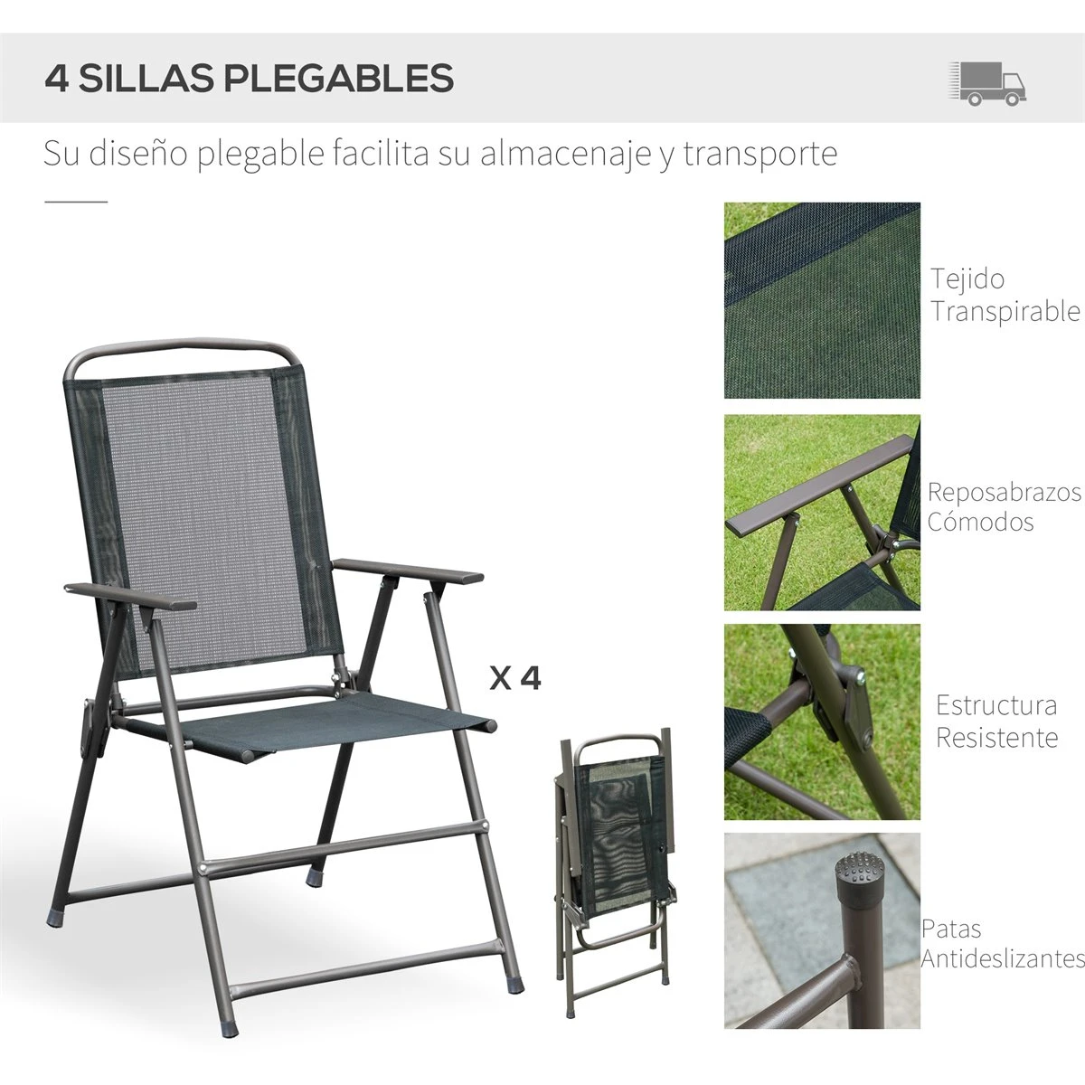 ¡Echa un vistazo a este juego al aire libre de Outsunny y completa tu jardín! Incluye 4 sillas plegables y una mesa redonda con encimera de vidrio que cuenta con un orificio para una sombrilla. Además, ¡la sombrilla está incluido! Este juego está construido de un marco de acero que es fuerte y resistente al óxido, y la malla transpirable de las sillas es transpirable para todo el años. Es una gran adición a tu patio para que disfrutes del tiempo libre con tus familiares y amigos. Características – Un práctico juego de comedor adecuado para patio, terraza, jardín o junto a la piscina – La sombrilla tiene una construcción de 8 varillas, por lo que es muy resistente – Estructura de acero de alta calidad y tejido de malla transpirable – La sombrilla de patio con un diseño hermoso de borde puede proporcionar sombra – Encimera con vidrio templado de 5 mm de espesor – Las sillas son plegables para facilitar su almacenaje y transporte Especificaciones – Color: negro – Material: acero, poliéster – Medidas de la mesa: Ø80×69,5 cm (DiámxAL – Medidas de la silla: 53,5x64x90 cm (LxANxAL – Medidas de la sombrilla: Ø170×200 cm (DiámxAL – Capacidad de carga: (mesa 50 kg, (silla 136 kg – Referencia: 01-0709