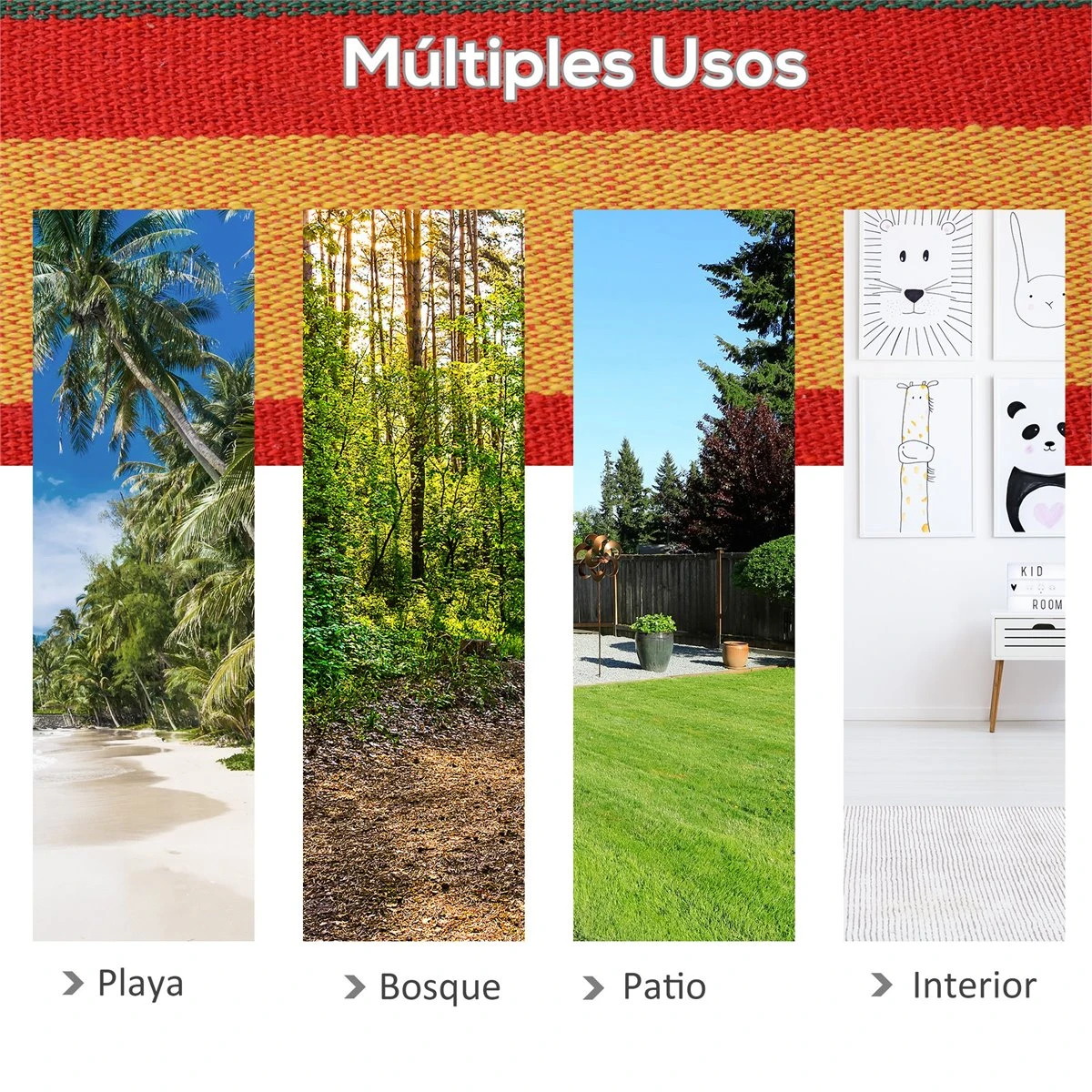 ¿Has visto esta hamaca de rayas multicolores de Outsunny? Ideal para disfrutar de una tarde tomando el sol o relajarte con un buen libro a la sombra de los árboles o en un soporte para hamacas (no incluido. Confeccionada en tela de algodón 100% con fuertes nudos de cuerda a cada lado, soporta hasta 120 kg y es lavable a 30ºC. Características – Hamaca de diseño moderno y actual con estampado de rayas multicolores – Tejido de algodón 100% para mayor comodidad y absorción de la humedad – Hamaca espaciosa ideal para descansar, leer o echar una siesta al aire libre – Para uso interior y exterior, apta para llevar de acampada, al camping o cualquier otro espacio al aire libre o que cuente con un soporte para su colocación – Fácil de instalar y como es plegable también podrás guardarla fácilmente en cualquier lugar – Este producto incluye solo el tejido de la hamaca, NO incluye soporte, ganchos ni cuerdas de fijación – Tejido resistente y lavable a 30°C – Consejo: Tumbarse en diagonal para una mejor postura de la espalda Especificaciones – Color: rayas multicolor – Material: 100% algodón – Medidas de la tela: 200×100 cm (LxAN – Longitud total: 2,9 m – Peso máximo soportado: 120 kg – Referencia: 100110-081 – Nota: La etiqueta de este producto presenta un error, poniendo que el peso máximo es 105kg/230lbs, cuando en realidad es 120kg/330lbs