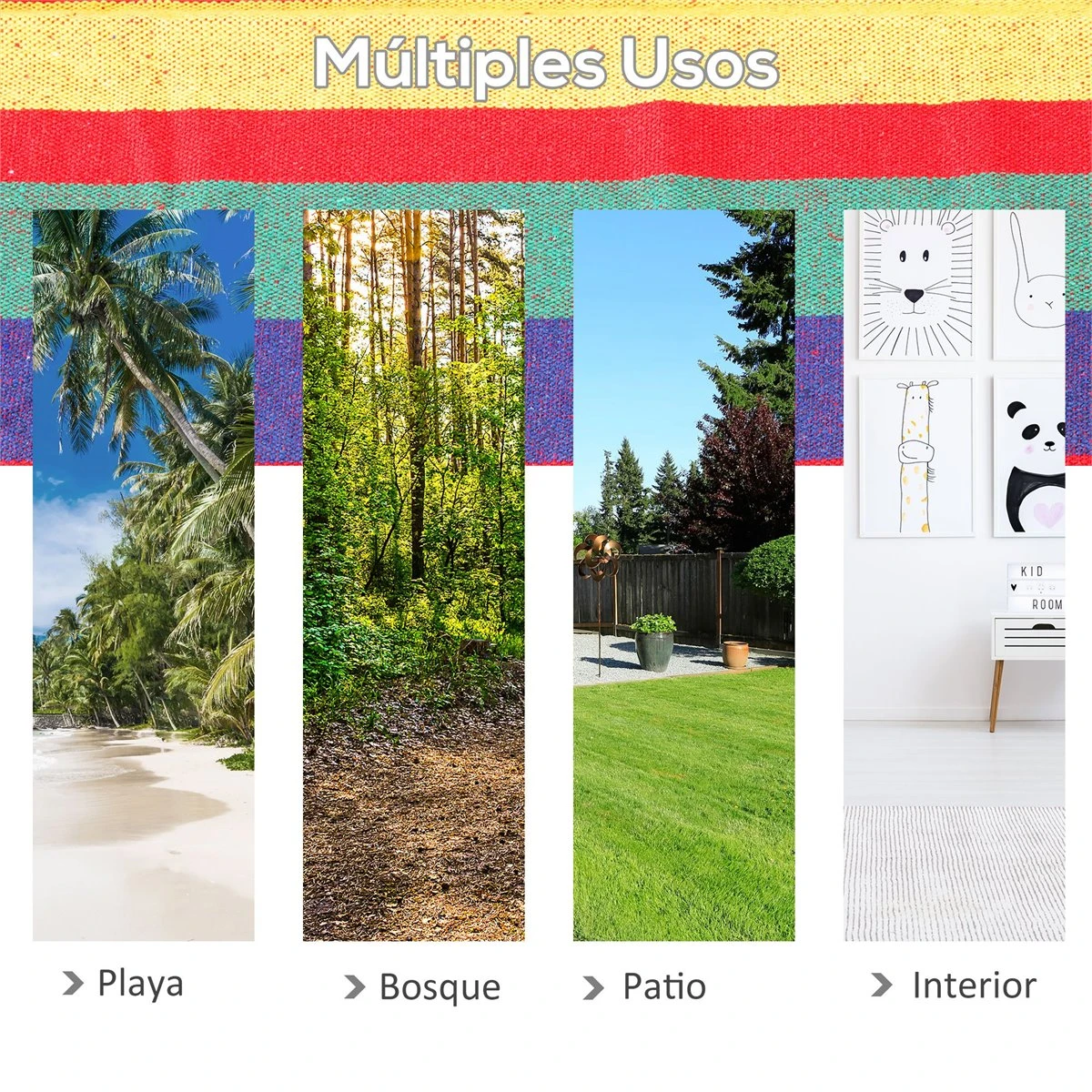 ¿Has visto esta hamaca de rayas multicolores de Outsunny? Ideal para disfrutar de una tarde tomando el sol o relajarte con un buen libro a la sombra de los árboles o en un soporte para hamacas (no incluido. Confeccionada en tela de algodón 100% con fuertes nudos de cuerda a cada lado, soporta hasta 180 kg y es lavable a 30ºC. Características – Hamaca de diseño moderno y actual con estampado de rayas multicolores – Tejido de algodón 100% para mayor comodidad y absorción de la humedad – Hamaca espaciosa ideal para descansar, leer o echar una siesta al aire libre – Para uso interior y exterior, apta para llevar de acampada, al camping o cualquier otro espacio al aire libre o que cuente con un soporte para su colocación – Fácil de instalar y como es plegable también podrás guardarla fácilmente en cualquier lugar – Este producto incluye solo el tejido de la hamaca, NO incluye soporte, ganchos ni cuerdas de fijación – Tejido resistente y lavable a 30°C – Consejo: Tumbarse en diagonal para una mejor postura de la espalda Especificaciones – Color: rayas multicolor – Material: 100% algodón – Medidas de la tela: 210×150 cm (LxAN – Longitud total: 3,1 m – Peso máximo soportado: 180 kg – Referencia: 100110-080