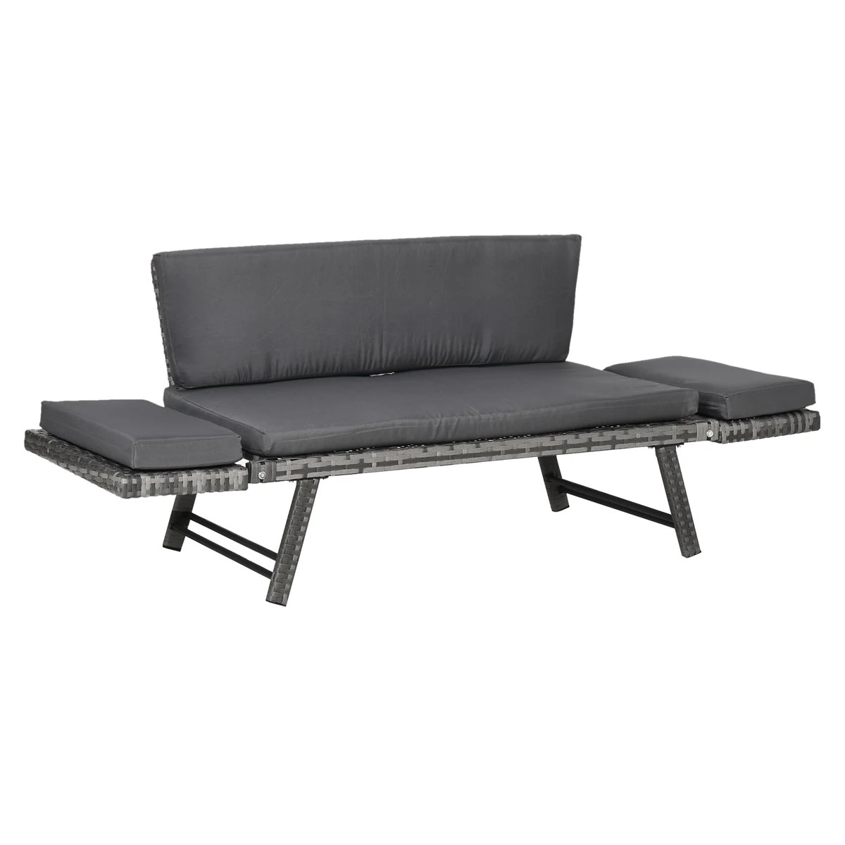 ¿Quieres un espacio donde descansar cómodamente al aire libre? Este sofá cama de ratán de Outsunny, es el complemento perfecto no solo para tus áreas de exterior, sino también de interior. Este mueble se convierte fácilmente de un sofá a una cama únicamente extendiendo los laterales. Perfecto para echarte la siesta, para tener un bonito sofá en tu zona privada del jardín o para huéspedes inesperados. Características – Sofá cama de ratán sintético, con marco resistente de acero – Combina elegancia y comodidad – Incluye 4 cojines acolchados para mayor comodidad (asiento, respaldo y 2 laterales – Funda de los cojines de poliéster impermeable de 180 g/m² y relleno de algodón de 600 g/m² – Se puede convertir fácilmente de sofá a cama tan solo moviendo los laterales abatibles – Adecuado tanto para uso interior como exterior – Fácil de mantener y limpiar con un paño húmedo – Se requiere montaje Especificaciones – Color: gris – Material: acero, ratán PE y tejido de poliéster de 180 g/m² – Medidas totales (sofá: 129x63x67 cm (LxANxAL – Medidas con las alas extendidas (cama: 167x63x66 cm (LxANxAL – Medidas del asiento: 105x60x30 cm (LxANxAL – Altura del respaldo: 37 cm – Cojín del asiento: 105x60x5 cm (LxANxAL – Cojín del respaldo: 107/98x35x5 cm (LxANxAL – Cojín de los laterales: 60x27x5 cm (LxANxAL – Carga máxima: 220 kg – Certificaciones: EN581-1-2 – Referencia: 860-049GY