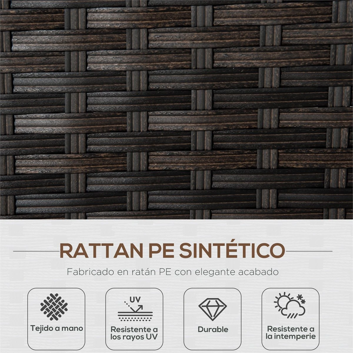 Este elegante sofá de ratán de Outsunny ofrece espacio para dos personas. La resistente estructura de metal con recubrimiento en polvo, para mayor resistencia a la intemperie y a la corrosión, está envuelta en ratán sintético y requiere poco mantenimiento. Viene con cojines gruesos con fundas con cremallera que son fáciles de lavar y cómodos. Un complemento elegante para completar tu patio y aprovechar al máximo tu espacio exterior. Características – Asiento amplio para sentarse cómodamente 2 personas – Adecuado para espacios exteriores como el jardín, terraza o patio – Armazón de acero galvanizado envuelto en ratán de PE duradero – Cojín acolchado de 10 cm de grosor y cojín de respaldo blando – Las fundas de los cojines con cremalleras se pueden quitar y lavar fácilmente – Pies con almohadillas ajustables para proteger el suelo – Se requiere montaje Especificaciones – Color: ratán marrón oscuro, cojines grises – Material: metal, Ratán PE, poliéster – Medidas totales: 132x70x74 cm (LxANxAL – Medidas del asiento: 120×65 cm (LxAN – Grosor del cojín: 10 cm – Carga máxima: 220 kg – Certificaciones: EN581 – Referencia: 860-186