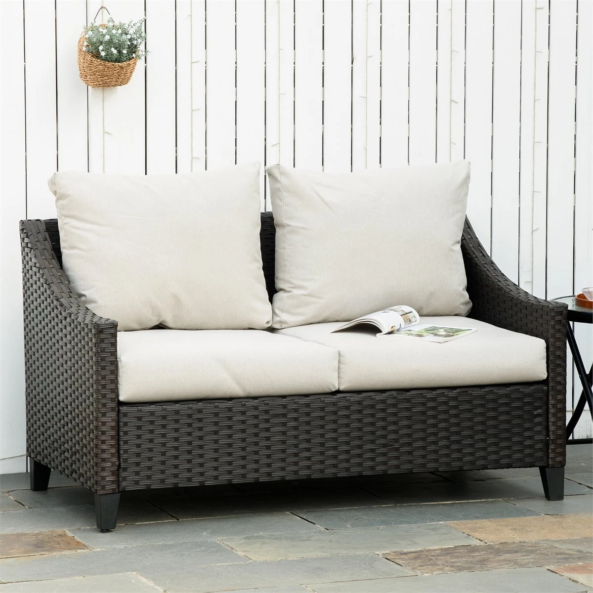 - – SOFÁ RATÁN DE EXTERIOR: Este sofá biplaza de jardín de diseño sencillo es perfecto para tener en el porche, el jardín, el patio trasero o en la zona de descanso cercano a la piscina. Aunque está especialmente diseñado para poder estar al aire libre, también se puede usar en espacios interiores – MATERIAL RESISTENTE: Este sofá de exterior está fabricado con una estructura de acero galvanizado con recubrimiento en polvo, para mayor resistencia a la oxidación y a la intemperie, y envuelto con mimbre PE que es duradero para todas las estaciones, elegante y cómodo – PIES AJUSTABLES: Este sofá de ratán sintético tiene pies ajustables para garantizar su estabilidad en superficies irregulares y también ayudan a proteger el suelo de rayones – ASIENTO CÓMODO: Este elegante sofá de ratán para exteriores aporta una sensación refinada y moderna a tu espacio exterior. Los cojines del asiento, con un acolchado de 10 cm, te ofrecen una relajación absoluta. Las fundas de los cojines tienen cremallera para poder quitarlas y lavar con facilidad – MEDIDAS TOTALES: 132x70x74 cm (LxANxAL. Medidas del asiento: 120×65 cm (LxAN. Peso máximo soportado: 220 kg. Se requiere montaje
