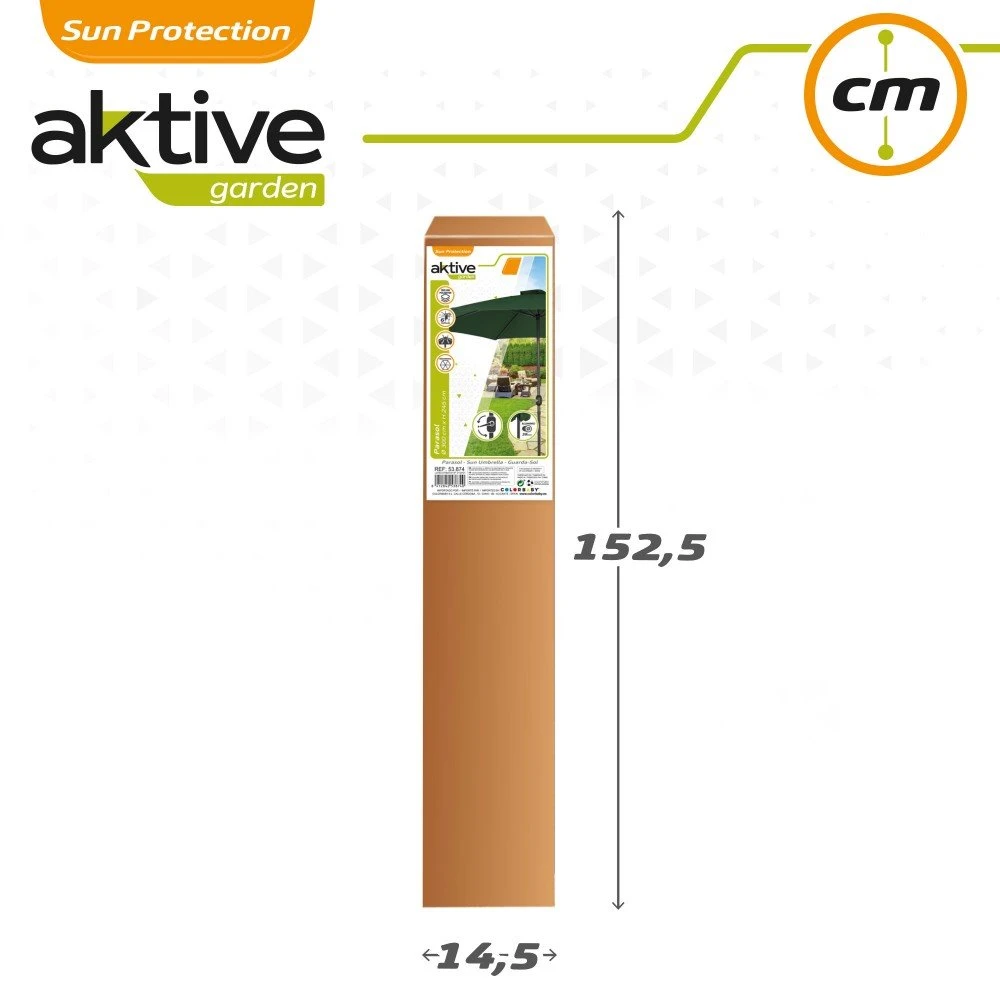 Parasol para jardín o terraza Aktive Garden. Formato hexagonal y diámetro de 300cm. La altura del parasol es de 240 cm. Material 100 % poliéster de 160 gr/m2encolor verde, ideal para exteriores. Con apertura y cierre mediante manivela giratoria. Estructura de aluminio con 6 varillas y mástil de 38 mm. Techo tipo chimenea para mejorar el paso del aire y darle mayor estabilidad.