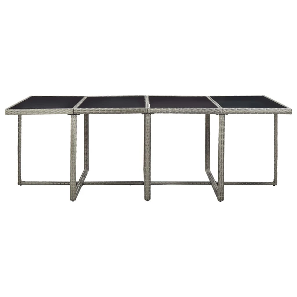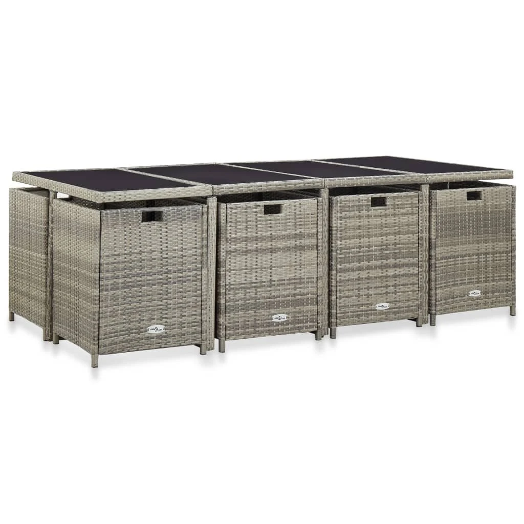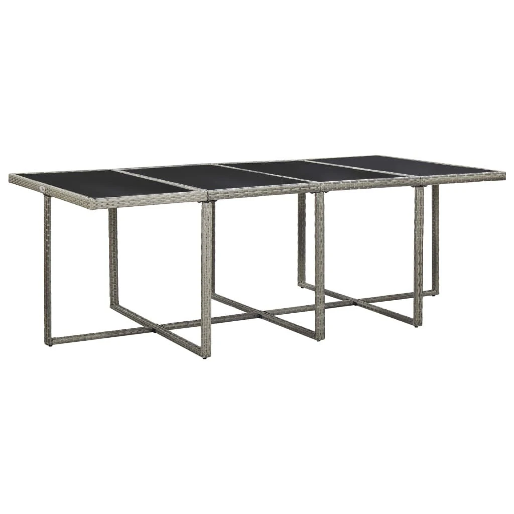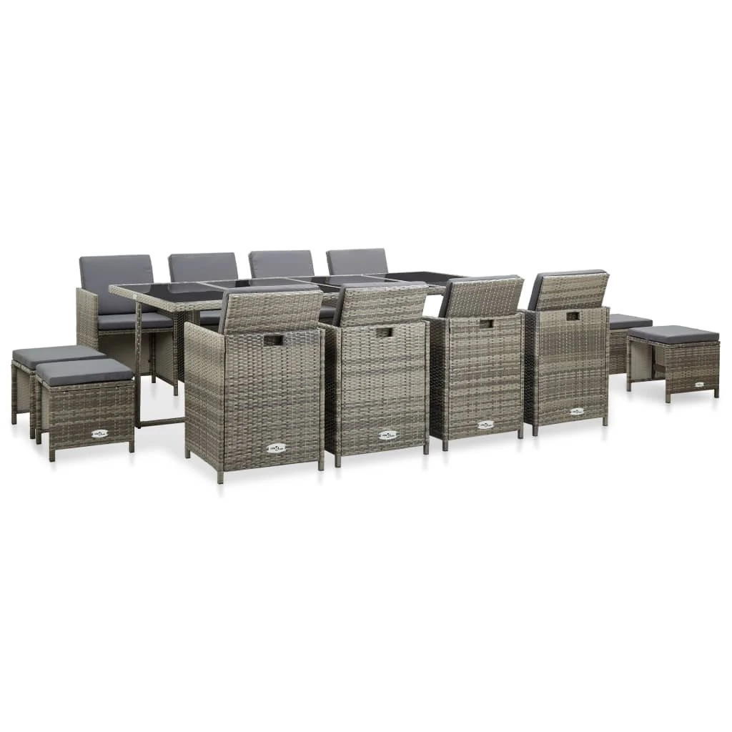 ¡Nuestro elegante set de muebles de ratán para jardín, se convertirá en el punto de atracción de tu jardín o patio! Este set de comedor de mimbre, con un elegante diseño, será una gran elección para comer al aire libre o relajarse en el jardín. La estructura de acero con recubrimiento en polvo brinda fuerza y resistencia a la mesa, sillas y taburetes, y gracias a su construcción ligera, todos los muebles son fáciles de desplazar. Gracias al mimbre PE impermeable y resistente a la intemperie, el set de comedor es fácil de limpiar. La encimera de cristal también se puede limpiar fácilmente con un paño húmedo. Los cojines para asiento y respaldo, gruesos, suaves y rellenos de espuma, son muy cómodos y están hechos de poliéster impermeable. Las fundas extraíbles y lavables tienen cremalleras. La entrega incluye 1 mesa, 8 sillas, 4 taburetes y 20 cojines. Nota: Te recomendamos cubrir el conjunto en condiciones de lluvia, nieve o heladas. Color: Ratán gris + cojín grisMaterial: Estructura de acero + ratán PE + encimera de cristalMaterial de cojín: Funda de poliéster con relleno de espumaDimensiones de la mesa: 225 x 109 x 74 cm (largo x ancho x altoDimensiones de las sillas: 52 x 56 x 85 cm (ancho x profundo x altoProfundidad del asiento: 40 cmAnchura del asiento: 46,5 cmAltura del asiento desde el suelo: 44 cmAltura del reposabrazos desde el suelo: 67 cmDimensiones de taburetes: 41 x 41 x 35 cm (largo x ancho x altoGrosor del cojín: 5 cmFunda de cojín extraíbleLa entrega incluye:1 x Mesa8 x Sillas4 x Taburetes20 x CojinesMaterial: Poliéster: 100%
