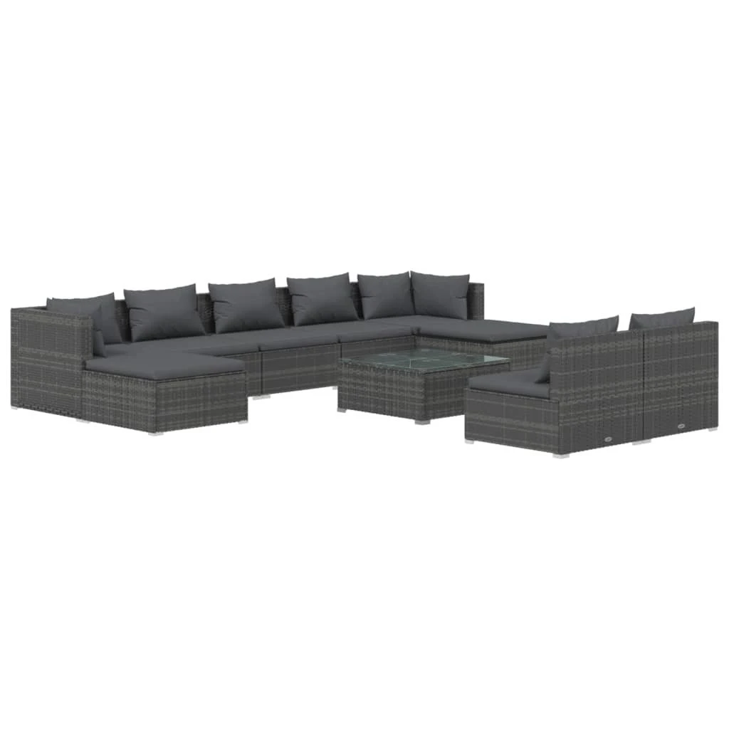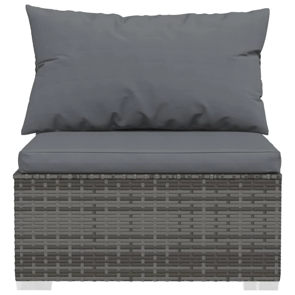 ¡Relájate y disfruta de tu tiempo libre con este moderno juego de muebles de jardín! Está destinado a satisfacer diferentes necesidades. Estructura robusta: Este asiento para patio cuenta con una robusta estructura de acero con recubrimiento en polvo y patas de plástico cromado, que es muy duradero.Material de primera calidad: El sofá de jardín está diseñado con ratán PE resistente al agua, por lo que es fácil de limpiar, robusto y adecuado para usar a diario al aire libre.Diseño modular: El diseño modular también permite colocar el conjunto en cualquier disposición o combinarlos con otros segmentos modulares para satisfacer tus necesidades.Cómodos cojines y almohadas: Los cojines y las almohadas acolchados gruesos y extraíbles brindan una comodidad óptima para que te sientes al aire libre. Nota:Para prolongar la vida de tus muebles de exterior, te recomendamos que los protejas con una funda impermeable. Color: GrisColor de cojín: Gris antracitaMaterial: Ratán PE, acero con recubrimiento en polvo, plástico, vidrioMaterial del cojín/almohadón: Tela (100% poliésterSofá central:Dimensiones de cada sofá central: 70 x 70 x 60,5 cm (largo x ancho x altoProfundidad del asiento: 63 cmAltura del asiento desde el suelo: 30 cmDimensiones del cojín de asiento: 70 x 63 x 3 cm (largo x ancho x grosorDimensiones del almohadón de respaldo: 70 x 40,5 cm (largo x anchoSofá esquinero:Dimensiones: 70 x 70 x 60,5 cm (largo x ancho x altoProfundidad del asiento: 63 cmAltura del asiento desde el suelo: 30 cmDimensiones del cojín de asiento: 63 x 63 x 3 cm (largo x ancho x grosorDimensiones del almohadón de respaldo grande/pequeño: 63/53 x 40,5 cm (largo x anchoReposapiés:Dimensiones: 70 x 70 x 30 cm (largo x ancho x altoMesa de centro:Dimensiones: 60 x 60 x 30 cm (largo x ancho x altoRequiere montaje: SíLa entrega contiene:5 x Sofás centrales2 x Sofás esquineros2 x Reposapiés1 x Mesa de centro9 x Cojín de asiento9 x Almohada de espalda