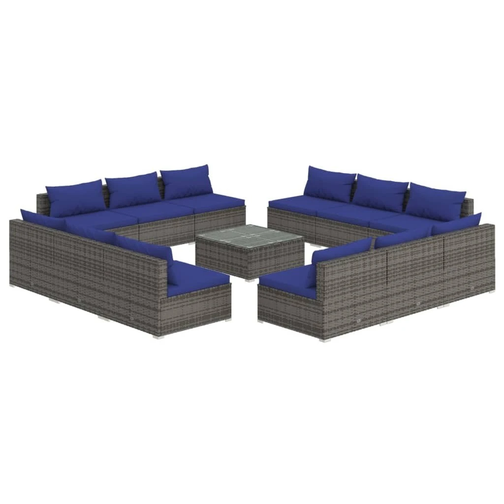 ¡Relájate y disfruta con amigos y familiares en tu jardín sobre este set de muebles de jardín de ratán sintético con cojines! Diseño modular: ¡Este diseño posibilita colocar el asiento en cualquier disposición o combinarlo con otros segmentos modulares para satisfacer tus necesidades!Material de primera calidad: El set de muebles de patio ha sido diseñado con ratán PE impermeable, por lo que es resistente y adecuado para usar a diario al aire libre.Estructura robusta: Este juego de muebles de exterior posee una robusta estructura de acero con recubrimiento en polvo y patas de cromado plástico, que son muy duraderas. Gracias a la construcción ligera, es fácil de mover.Cojines cómodos: Hechos de tela, los cojines con acolchado grueso son extraíbles y suaves al tacto, y te dan una mayor comodidad. Nota:Para prolongar la vida de tus muebles de exterior, te recomendamos que los protejas con una funda impermeable. Color: GrisColor del cojín: Azul oscuroMaterial: Ratán PE, acero con recubrimiento en polvo, plástico, vidrioMaterial del cojín/almohadón: Tela (100% poliésterDimensiones de la mesa de centro: 60 x 60 x 30 cm (largo x ancho x altoDimensiones del sofá central (cada uno: 70 x 70 x 60,5 cm (largo x ancho x altoProfundidad del asiento: 63 cmAltura del asiento desde el suelo: 30 cmDimensiones del cojín de asiento: 70 x 63 x 3 cm (largo x ancho x grosorDimensiones del almohadón de respaldo: 70 x 40,5 cm (largo x anchoRequiere montaje: SíLa entrega contiene:1 x Mesa de centro12 x Sofás centrales12 x Cojines de asiento12 x Almohada de espalda