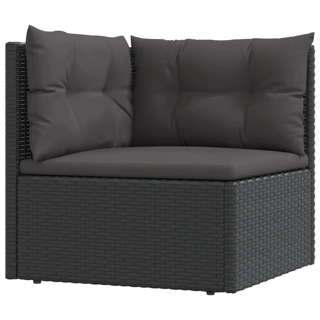 Este moderno conjunto de muebles de exterior, con un diseño elegante y moderno, es una gran opción para relajarse en el jardín. Material duradero: El ratán PE, también conocido como ratán sintético, es resistente a la intemperie y fácil de limpiar. La parte exterior se mantiene hermosa durante mucho tiempo. Es más económico que otros materiales, además de ofrecer una gran calidad, comodidad y aspecto estético.Estructura estable: El acero es un material muy duro y fuerte. Ofrece solidez y estabilidad. El recubrimiento en polvo sobre el acero crea una capa protectora contra el uso y el desgaste.Diseño modular: Cada pieza se puede mover con facilidad, lo que permite la creación de diferentes diseños que se ajusten a lo que necesites. También puedes encontrar los artículos individuales en nuestra tienda web para organizar tus propias configuraciones de muebles.Asiento ajustable: El asiento del sofá esquinero se puede ajustar en 3 ángulos para conseguir una posición sentada o recostada más cómoda.Cómodo asiento: Con los cojines de asiento y de respaldo bien acolchados, el juego de muebles de jardín es muy cómodo. Información útil:Para facilitar al máximo el montaje, cada producto se entrega con un manual. Nota:Para asegurarte de que tus muebles de exterior se mantengan hermosos, recomendamos protegerlos con una funda impermeable. Color: NegroMaterial: Ratán PE, acero con recubrimiento en polvoSofá esquinero:Dimensiones: 54 x 54 x 24,5/38/50/55 cm (ancho x profundo x altoDimensiones del asiento: 48,5 x 48,5 cm (ancho x profundoAltura del asiento desde el suelo: 24,5 cmSofá central:Dimensiones: 54 x 54 x 55 cm (ancho x profundo x altoDimensiones del asiento: 51,5 x 48,5 cm (ancho x profundoAltura del asiento desde el suelo: 24,5 cmReposapiés:Dimensiones: 53 x 51 x 24,5 cm (ancho x profundo x altoDimensiones del asiento: 48 x 50 cm (ancho x profundoAltura del asiento desde el suelo: 24,5 cmCojín:Color: NegroMaterial de la cubierta: Tela (100% poliésterMaterial de relleno: Espuma, fibra de algodónDimensiones del cojín de asiento: 53 x 51 x 3 cm (ancho x profundo x grosorDimensiones del cojín de respaldo (grande: 54 x 32 x 6 cm (ancho x profundo x grosorDimensiones del cojín de respaldo (pequeño: 40 x 32 x 6 cm (ancho x profundo x grosorLa entrega incluye:2 x Sofás esquineros2 x Sofás centrales3 x Taburetes/reposapiés6 x Cojines de asiento3 x Cojines de respaldo (grande1 x Cojín de respaldo (pequeño