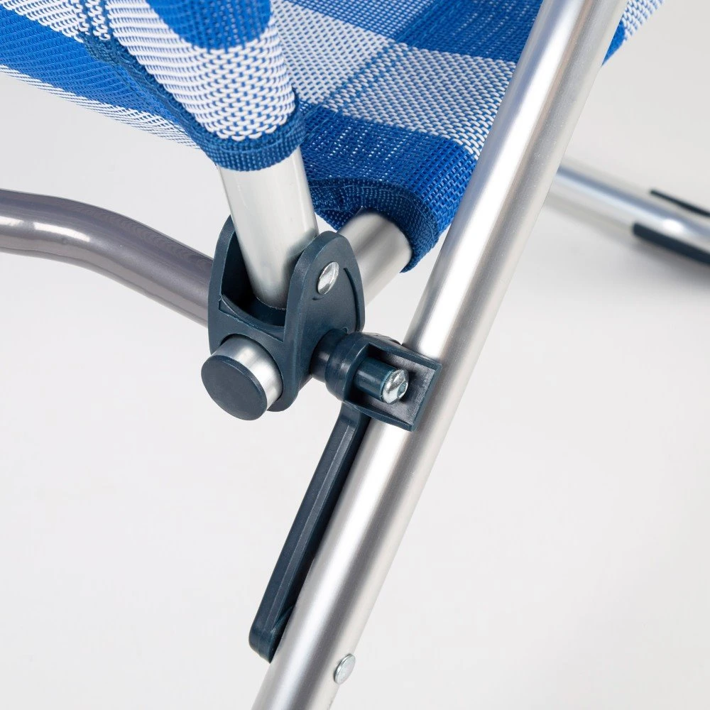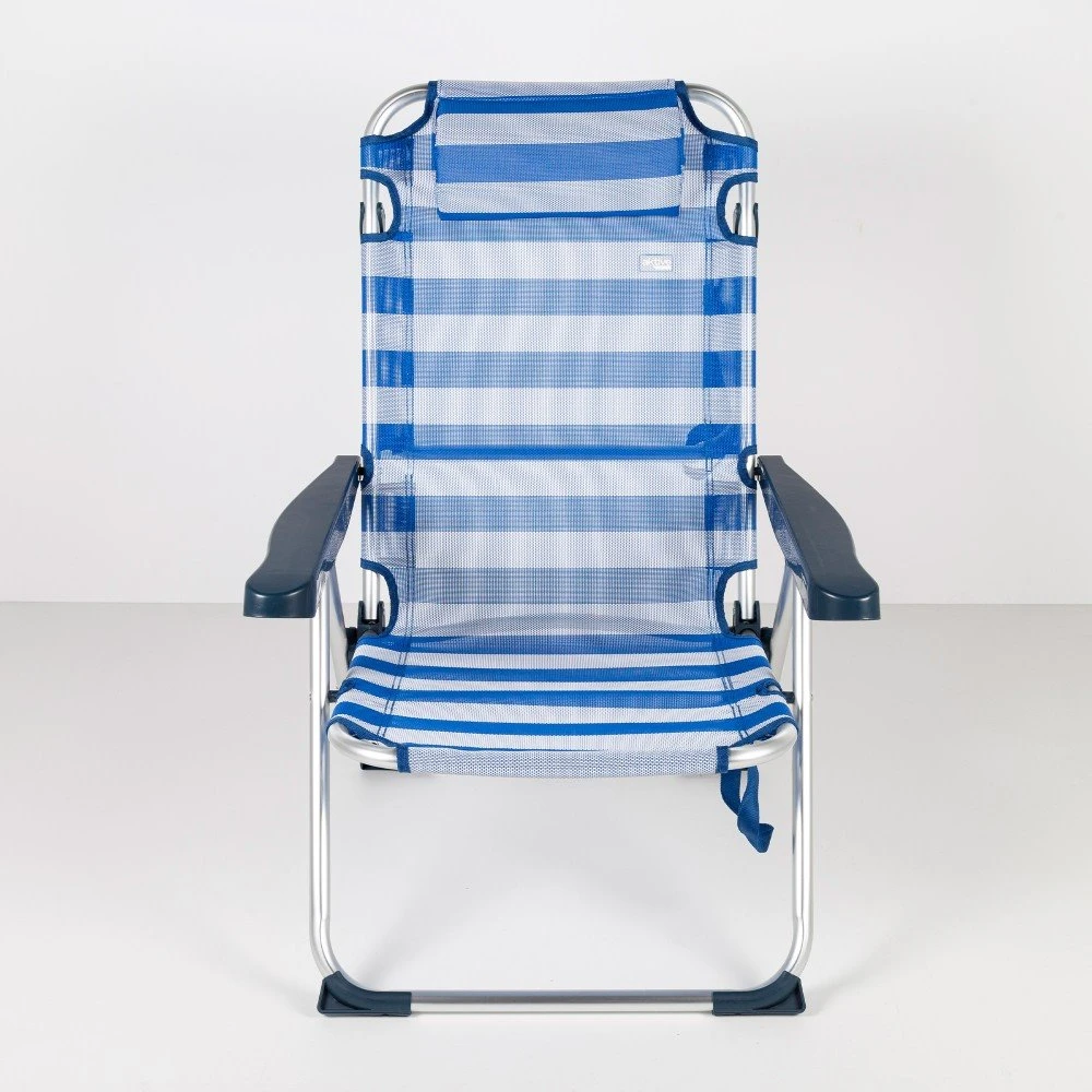 Silla de playa Aktive Beach diseñada para disfrutar de momentos de relax mientras tomas el sol en la playa. Está fabricada con estructura de aluminio plateado (soporta hasta 110 kg, tejido de poliéster Oxford 600D reforzado color azul y blanco a rayas y reposabrazos ergonómicos de plástico resistente color azul marino. La silla ofrece gran comodidad gracias a su cojín acolchado y al respaldo multiposición fácil de regular con los reposabrazos (5 posiciones. Incorpora soporte de aluminio trasero que permite reclinarse horizontalmente y convertirse en tumbona. Además, las patas incorporan topes antivuelco para más estabilidad y seguridad durante su uso y gracias a su asa de mano, es muy fácil de transportar, almacenar y apilar.