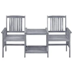 Las sillas de jardín de madera rústica con mesita serán un aporte verdaderamente fácil de usar y llamativo para tu jardín o patio. La mesa y las sillas están hechas de madera maciza de acacia, una madera dura con vetas densas que las hace extremadamente duraderas y resistentes. La robusta superficie de la mesa y el estante inferior son ideales para guardar tus tazas, libros y otros artículos pequeños. Y los respaldos y apoyabrazos de las sillas garantizan una experiencia de descanso relajante. Además, los muebles se limpian fácilmente con un paño húmedo. Nota: Para prolongar la vida útil de los muebles de exterior, te recomendamos que los limpies con regularidad y no los dejes al aire libre sin protección innecesariamente.Limpieza: Usa una solución de jabón suave.Almacenamiento: Si es posible, guarda el producto en un lugar fresco y seco en el interior. Si el producto se almacena al aire libre, protégelo con una funda impermeable. Limpia y seca el exceso de agua o nieve de las superficies planas después de una lluvia o nevada. Permite la ventilación para evitar daños relacionados con la humedad. Material: Madera maciza de acacia con acabado lavado grisDimensiones: 159 x 61 x 92 cm (largo x ancho x altoProfundidad del asiento: 49 cmAltura del reposabrazos: 61 cmAltura del asiento desde el suelo: 44 cmAltura de la mesa: 59 cmDiseño de listones distintivo 2 sillas y una mesa en diseño de una piezaRequiere montaje: Sí