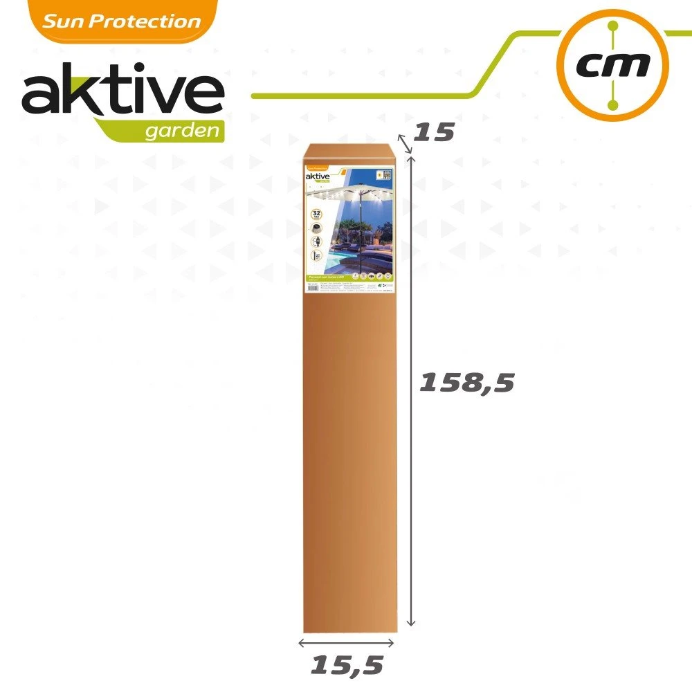 Sombrilla terraza con luces LED solares de Aktive Garden ideal para colocar en el jardín o la terraza y usar tanto por el día como por la noche. La sombrilla tiene formato octogonal, es de color crema, su material es poliéster de 160 gr y tiene protección UV50+ que protege frente los rayos del sol. El diámetro de la sombrilla es de 300 cm y el de su mástil fabricado de acero de 38 mm. El mástil lleva incorporada una manivela manual para abrir y cerrar la sombrilla cómodamente y botón para encender o apagar las 32 luces LED que se encuentran repartidas por las 8 varillas de aluminio y que se cargan mediante el sistema de carga solar situado en la parte superior. Además, el mástil es inclinable para adaptar la sombrilla a la posición del sol y el techo es de tipo chimenea, perfecto para favorecer la circulación del aire y hacerla más estable en días de viento suave.