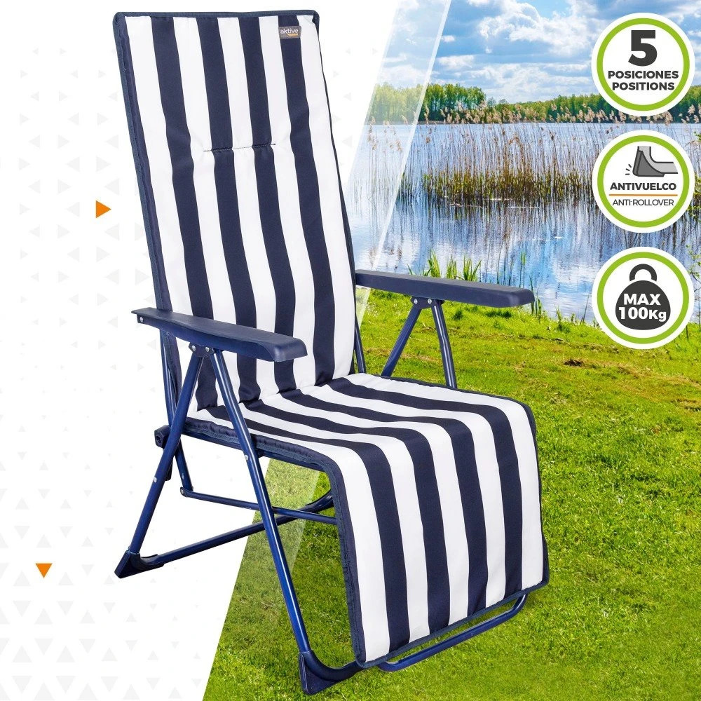 Tumbona plegable para jardín Aktive Garden con medidas: 59 cm de ancho x 59 cm de largo y 109 cm de alto. Se pliega por completo y tiene 5 posiciones que puedes regular a través de los reposabrazos de PVC color marino. Asiento de terileno cómodo, resistente y fácil de limpiar en rayas marineras azul y blanco. Cuenta con 1 cómodo reposapiés y tiene tacos antivuelco en las patas. Soporta 100 kg.