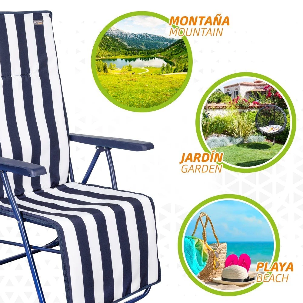 - Tiene 5 posiciones que se regulan a través de los reposabrazos, diseño marinero a rayas blancas y azules, se pliega por completo (medidas: 59×97